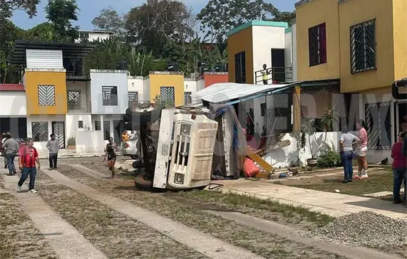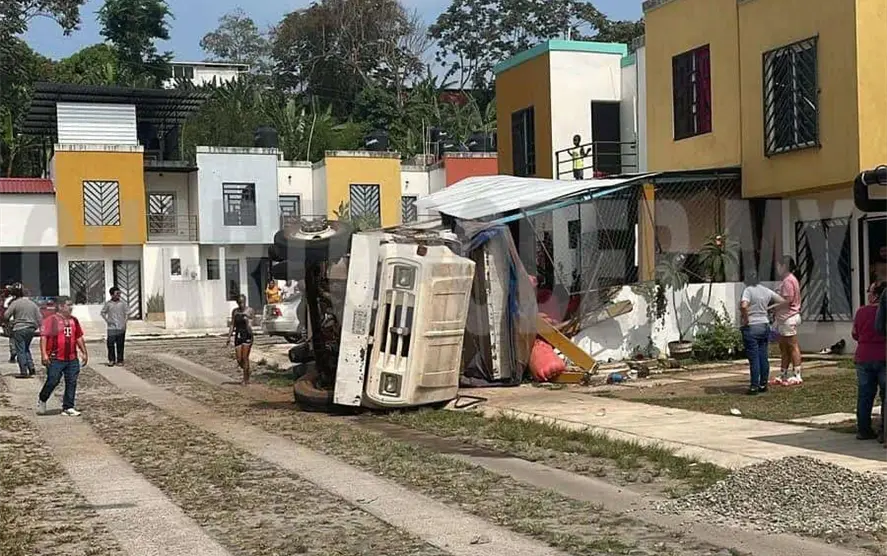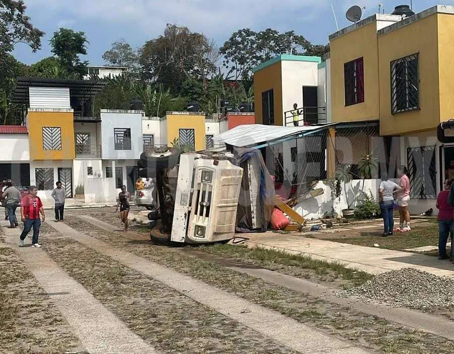 Impactado contra la fachada de una vivienda terminó un camión de carga al sufrir una volcadura en el fraccionamiento Finca Real, ubicado en la carretera de Tapachula a Nueva Alemania.