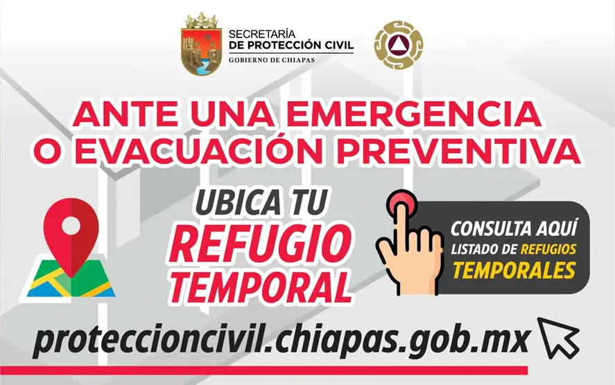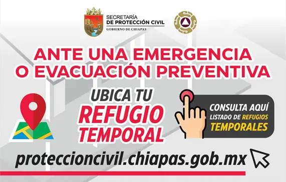 Puede consultar la ubicación del refugio temporal más cercano en proteccioncivil.chiapas.gob.mx, comunicándose con Protección Civil o con los Comités Comunitarios de Protección Civil.