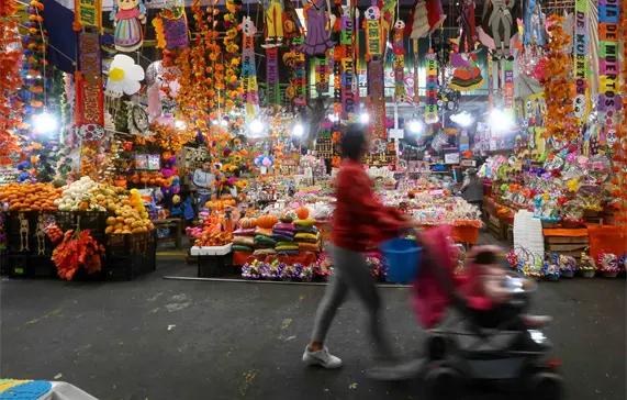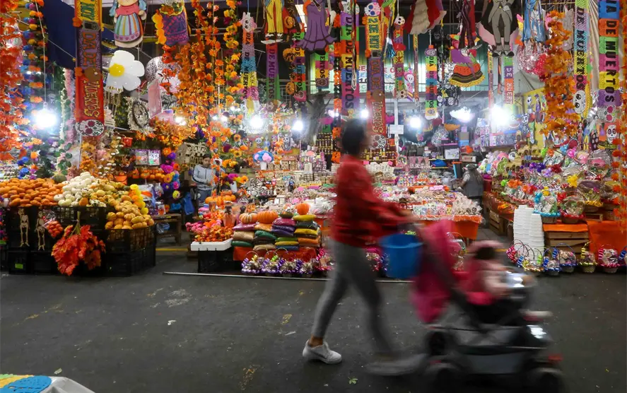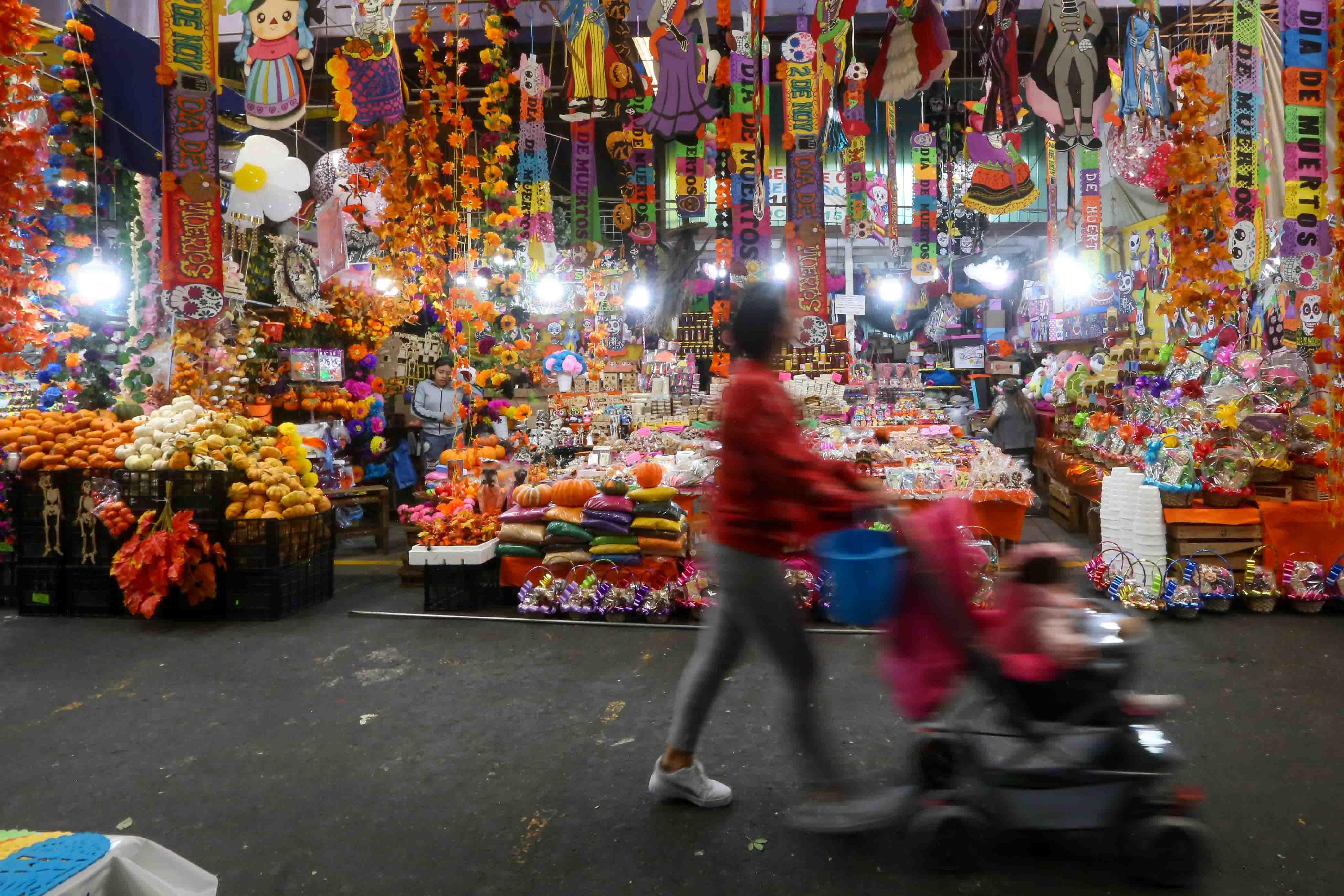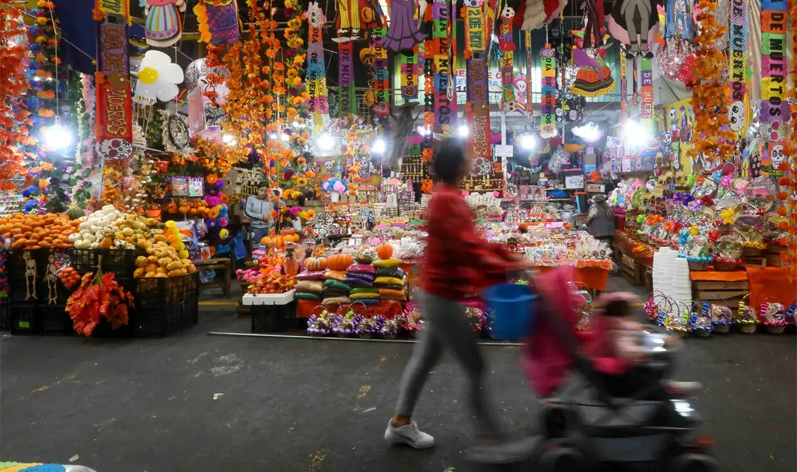 Entre flores de diversas especies, artículos para la decoración por el Día de Muertos, calaveras y calabazas, el mercado se ha vestido de tonalidades moradas y naranjas para recibir esta temporada del año.