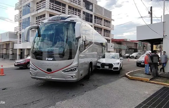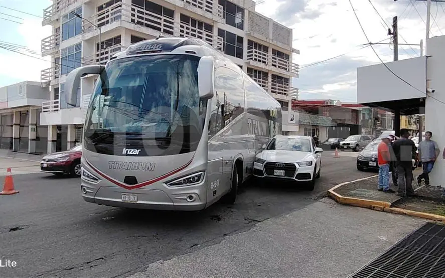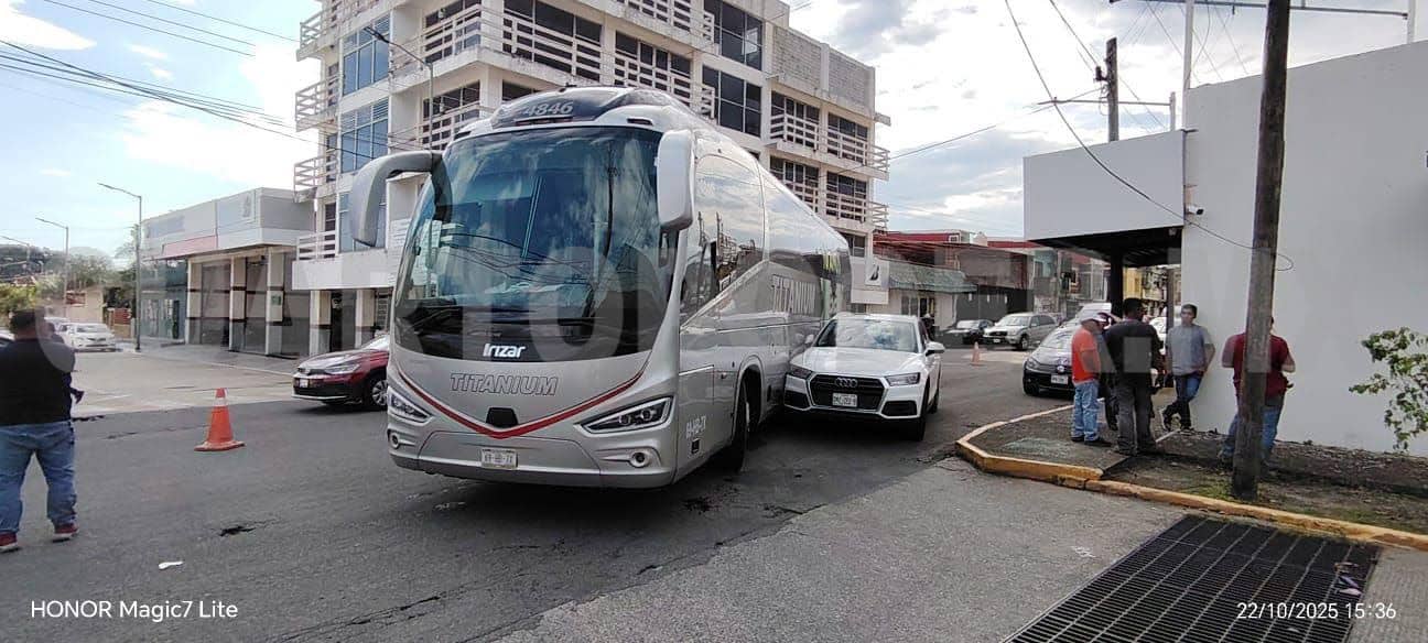 Solo daños materiales considerados en varios miles de pesos dejó choque en el centro de Tapachula, cuando un autobús de pasajeros produjo un corte de circulación para ingresar a la terminal de la empresa Titanium.