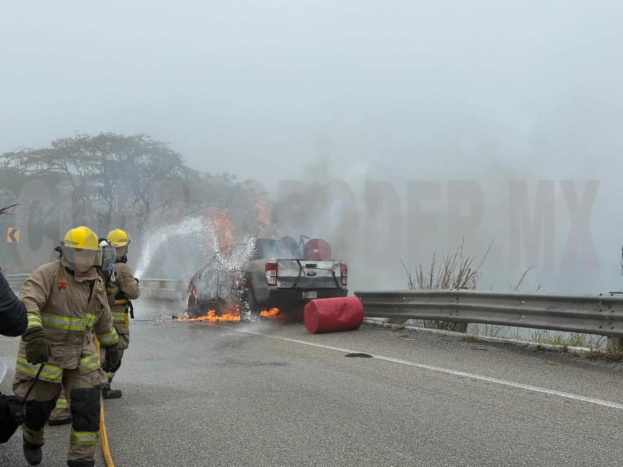 Envuelto en llamas fue como terminó una pick up luego de una presunta falla eléctrica sobre la autopista Ocozocoautla-Las Choapas, en el carril con dirección a Tuxtla Gutiérrez, a la altura del kilómetro 197+500, lo que generó que los "tragahumo" se presentaran rápidamente.