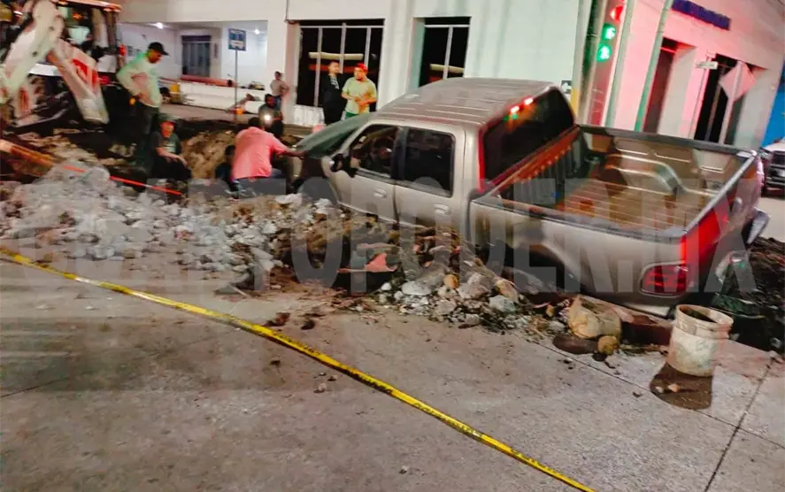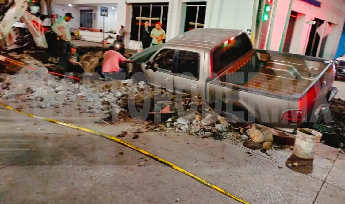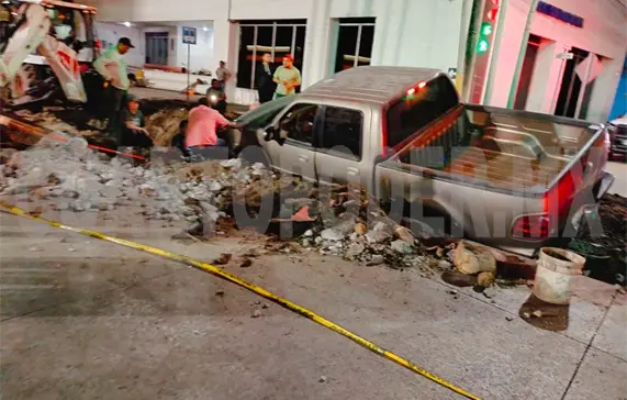El trabajador de una obra de pavimentación de calles resultó con lesiones leves, al ser impactado por una camioneta que no se dio cuenta de los avisos de alto y terminó dentro de una toma que estaba abierta, esto en el municipio de Tapachula.