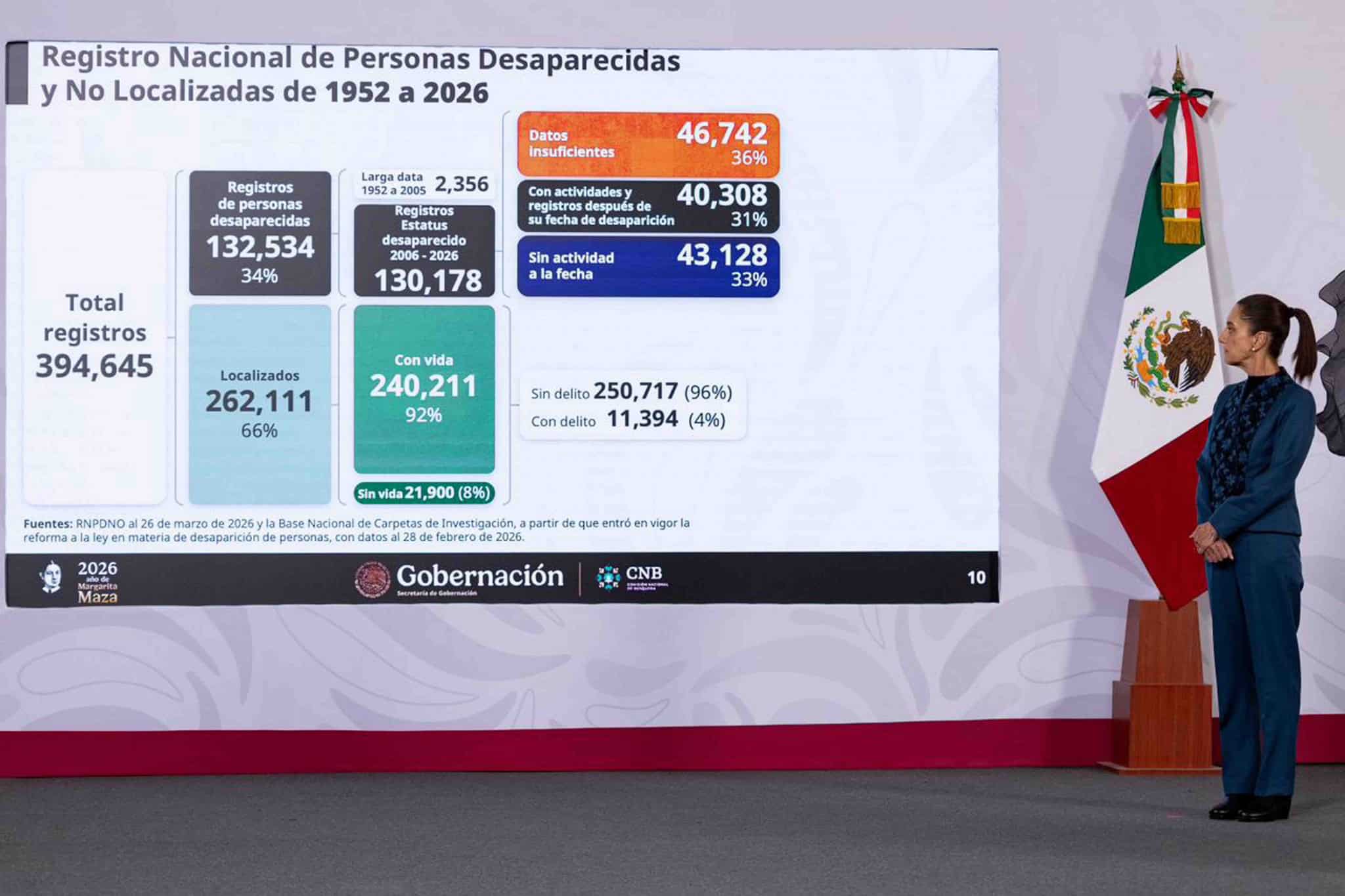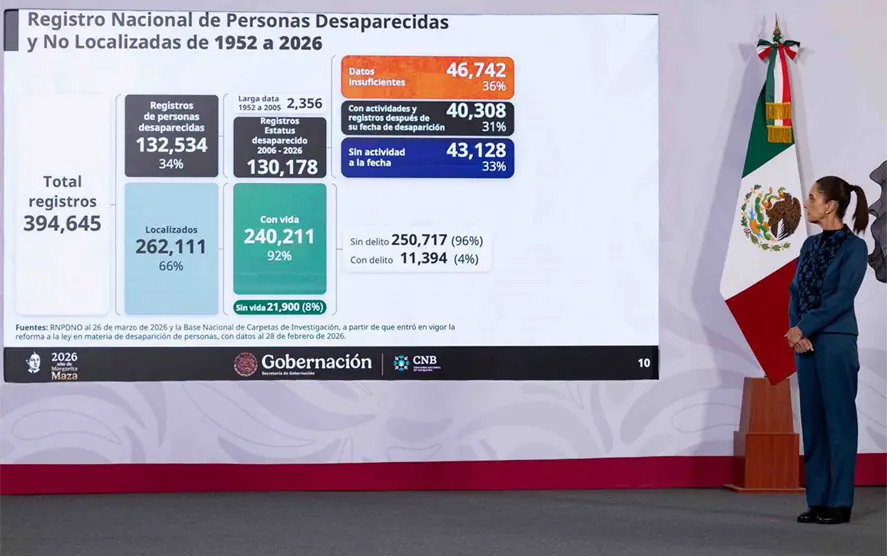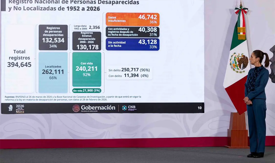 Durante la presentación del informe sobre personas desaparecidas en Palacio Nacional, la mandataria explicó que estas cifras derivan de un análisis del Registro Nacional de Personas Desaparecidas y No Localizadas, el cual permitió depurar y clasificar los casos existentes.