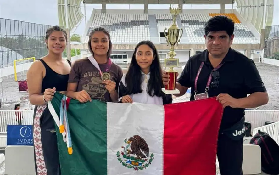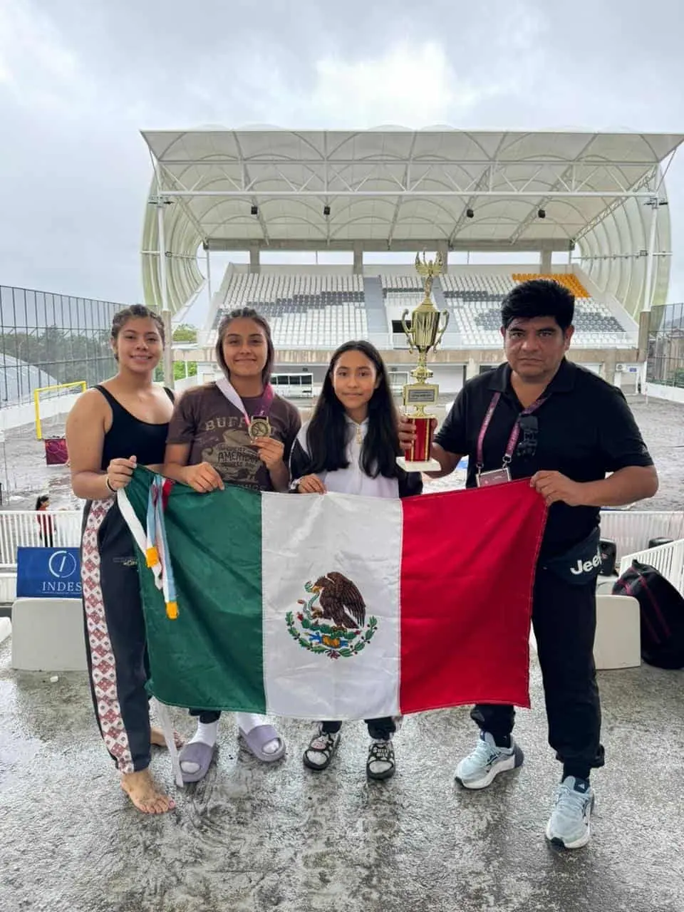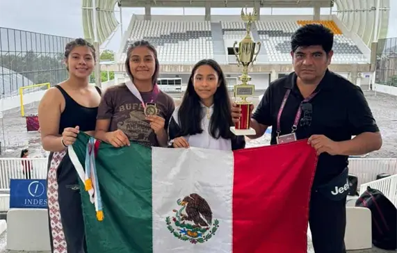 Las gladiadores chiapanecas Rubí Aguilar Montejo, Ximena Josette Domínguez Revueltas y Hannia Sayuri Casso López regresaron a Chiapas tras una brillante participación por México en el Campeonato Panamericano U-15, celebrado en El Salvador.