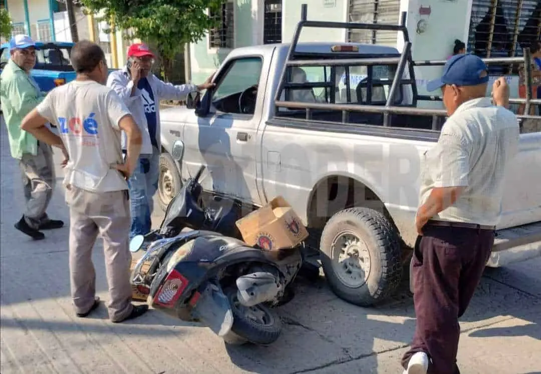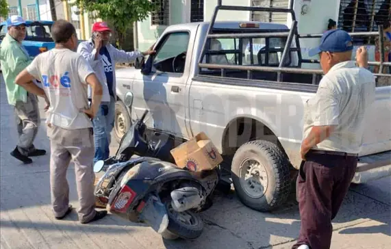 PIJIJIAPAN. Una camioneta se impactó contra la motocicleta y el conductor quedó por debajo de la unidad. El motociclista llevaba una carga de cartones de cerveza, esto en el Barrio Nuevo México.