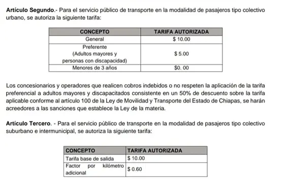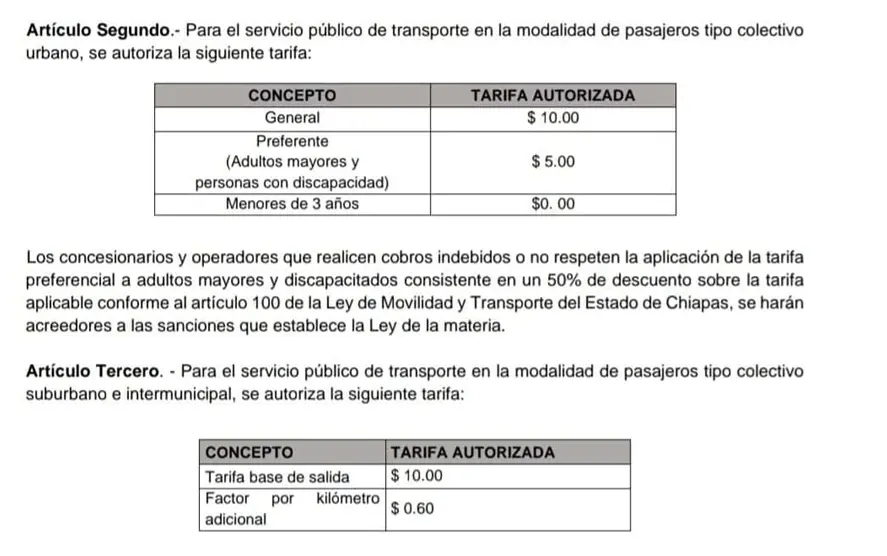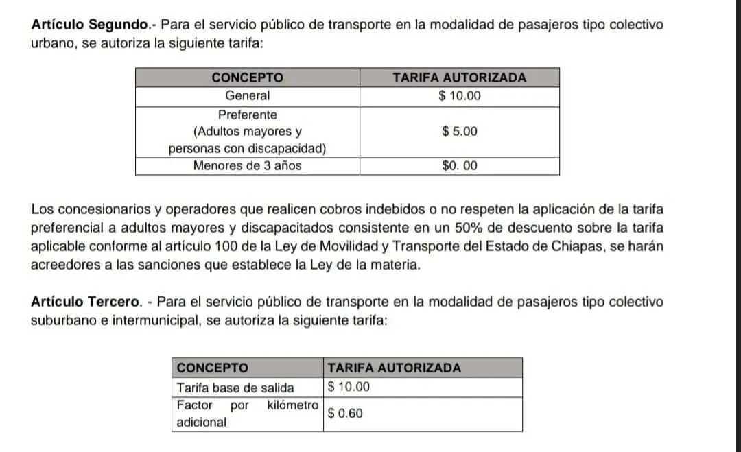 En el periodo oficial del estado de Chiapas, se publicó este miércoles la confirmación de que el precio al pasaje en la modalidad de colectivo pasó de 8 a 10 pesos. Para el caso de personas con discapacidad o adultos mayores pagarán cinco pesos