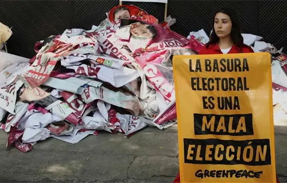 México.- Activistas de la organización ambientalista internacional Greenpeace México, hicieron un llamado a los candidatos de los diferentes partidos políticos y líderes de coaliciones a “hacerse cargo” de pendones y lonas de propaganda, también llamada “basura electoral”.