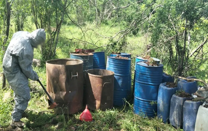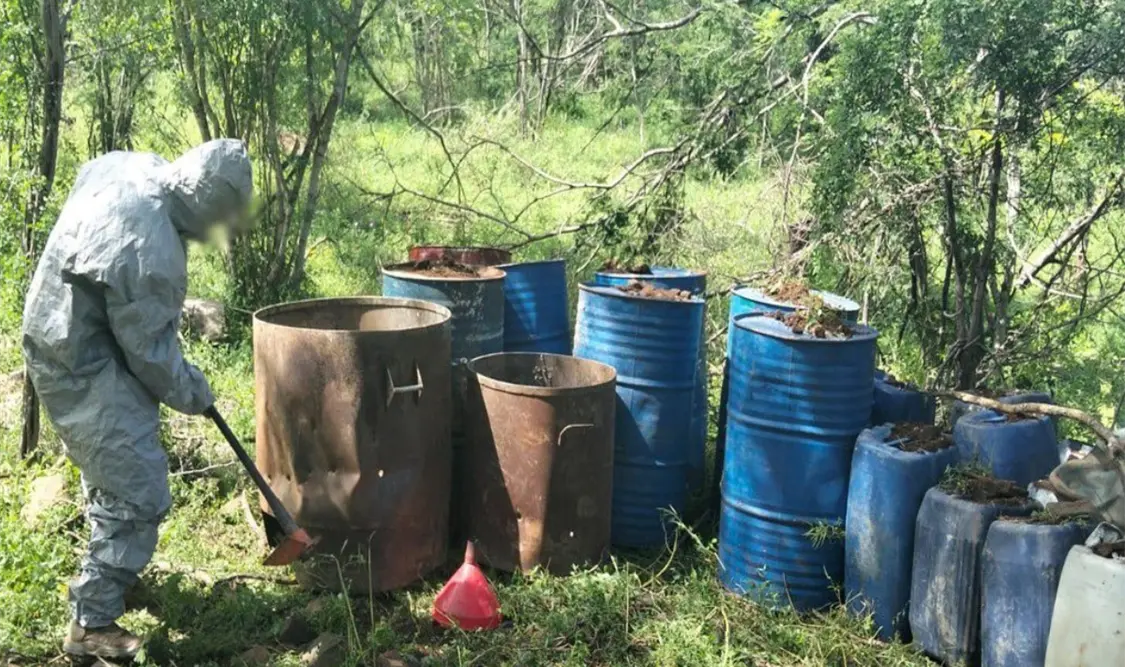México.- Autoridades federales localizaron e inhabilitaron un área de concentración de material diverso para la elaboración de metanfetamina, aseguraron mil 850 litros de sustancias químicas en Cosalá, Sinaloa, en el poblado Estancia de Los García.
