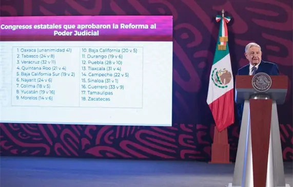 México.- El presidente Andrés Manuel López Obrador celebró que en 18 congresos estatales ya se aprobó la reforma al Poder Judicial, con lo que ya es constitucional.