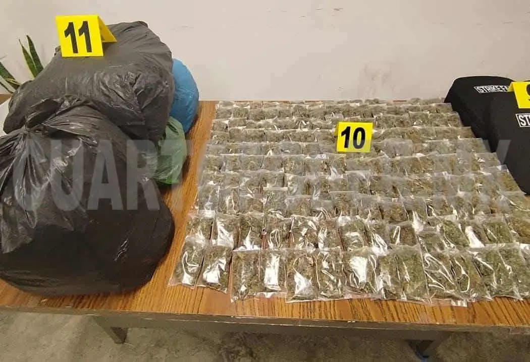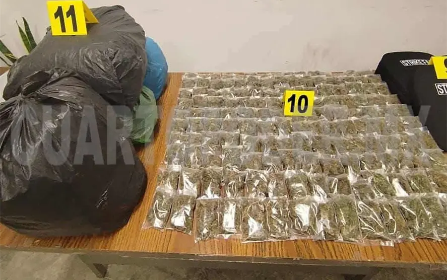 Se les aseguraron siete bolsas grandes y diversas dosis de hierba verde y seca con las características de la marihuana; así como cuatro armas largas, tres chalecos tácticos, cuatro gorras y diversos cartuchos de armas de fuego. Asimismo, se les decomisaron cuatro vehículos, todos reporte de robo.