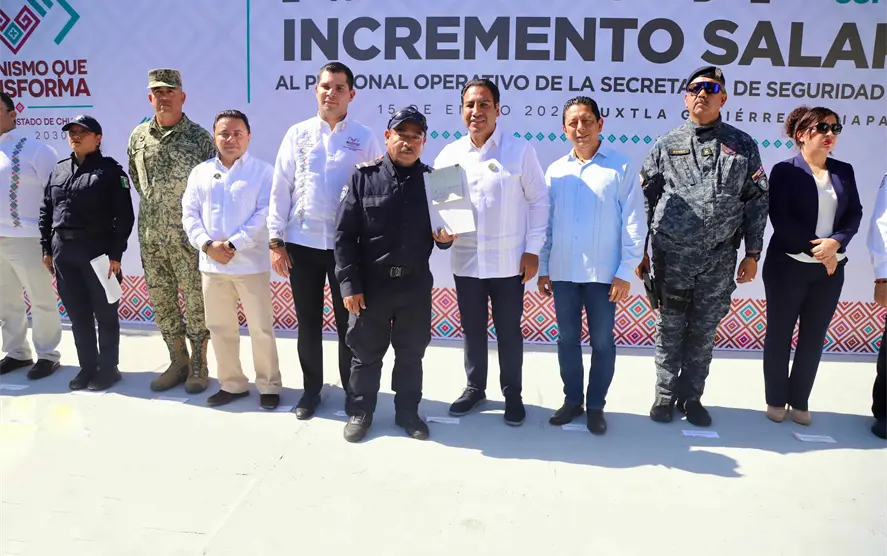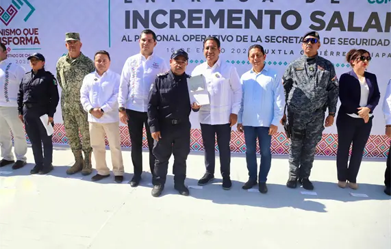El magistrado presidente del Poder Judicial del Estado, Juan Carlos Moreno Guillén, asistió a la entrega de incremento salarial a las y los policías del estado, encabezado por el gobernador del estado de Chiapas, Eduardo Ramírez Aguilar, y el secretario de Seguridad, Óscar Alberto Aparicio Avendaño.