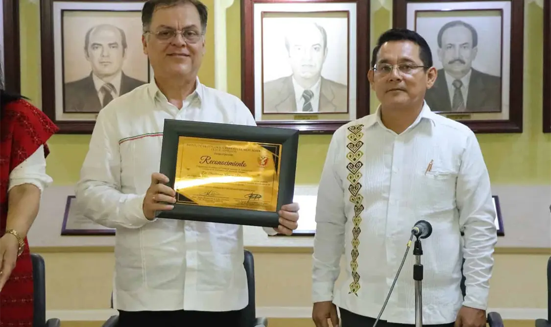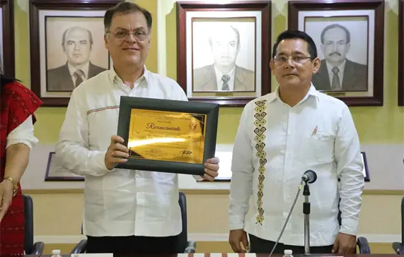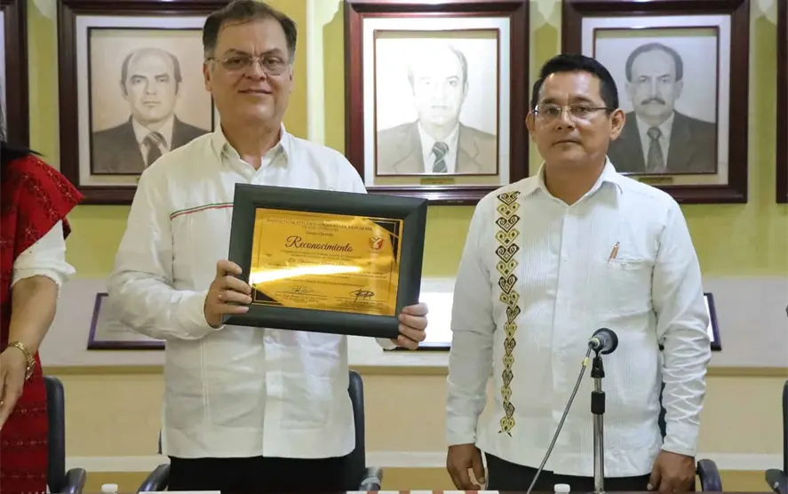 Desde la Sala de Presidentes, el magistrado presidente Guillermo Ramos Pérez, recibió de manos del director de la Universidad, Juan Manuel de la Cruz Guzmán, el reconocimiento que esta institución educativa, como parte del agradecimiento que se ha tenido por las conferencias, talleres y simulaciones de audiencia que esta casa de la justicia ha gestionado y ha beneficiado a estudiantes de la región de Mezcalapa.
