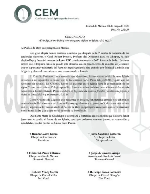 La Conferencia del Episcopado Mexicano (CEM) manifestó su alegría por la elección del cardenal estadounidense Robert Francis Prevost como el nuevo Papa León XIV, destacando que su designación como el 267.º sucesor de Pedro es resultado de la guía del Espíritu Santo. En un comunicado, los obispos mexicanos expresaron su obediencia filial al nuevo pontífice y agradecieron su generoso "sí" al aceptar esta misión con fe y esperanza. Invitaron al pueblo de Dios en México a elevar oraciones por el Santo Padre y a alegrarse por el inicio de su pontificado.