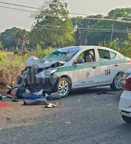 El lunes en la tarde sobre la carretera Tonalá-Puerto Arista, a la altura del puente Capulín, en las inmediaciones de una gasolinera, sucedió un fatal choque entre una motocicleta y una unidad de transporte público en modalidad de taxi.
