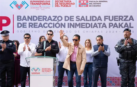 El Fiscal General del Estado, Jorge Luis Llaven Abarca, y el Secretario de Seguridad del Pueblo, Óscar Alberto Aparicio Avendaño, dieron banderazo de inicio a las operaciones de la Fuerza de Reacción Inmediata Pakal (FRIP), en Comitán de Domínguez.