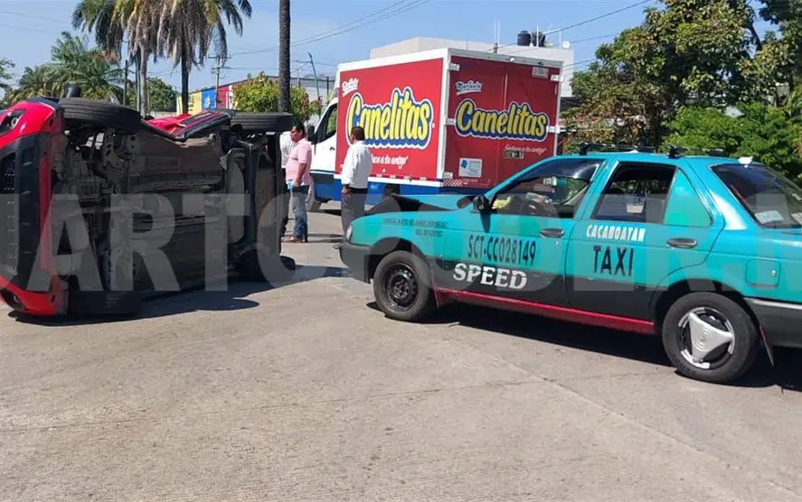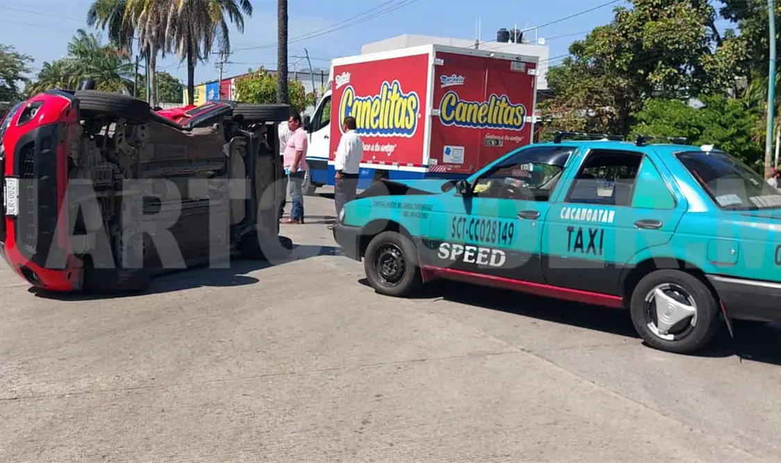 Un vehículo particular quedó volcado tras ser impactado de costado por un taxi foráneo, por lo que dos personas resultaron lesionadas, esto en el municipio de Tapachula.