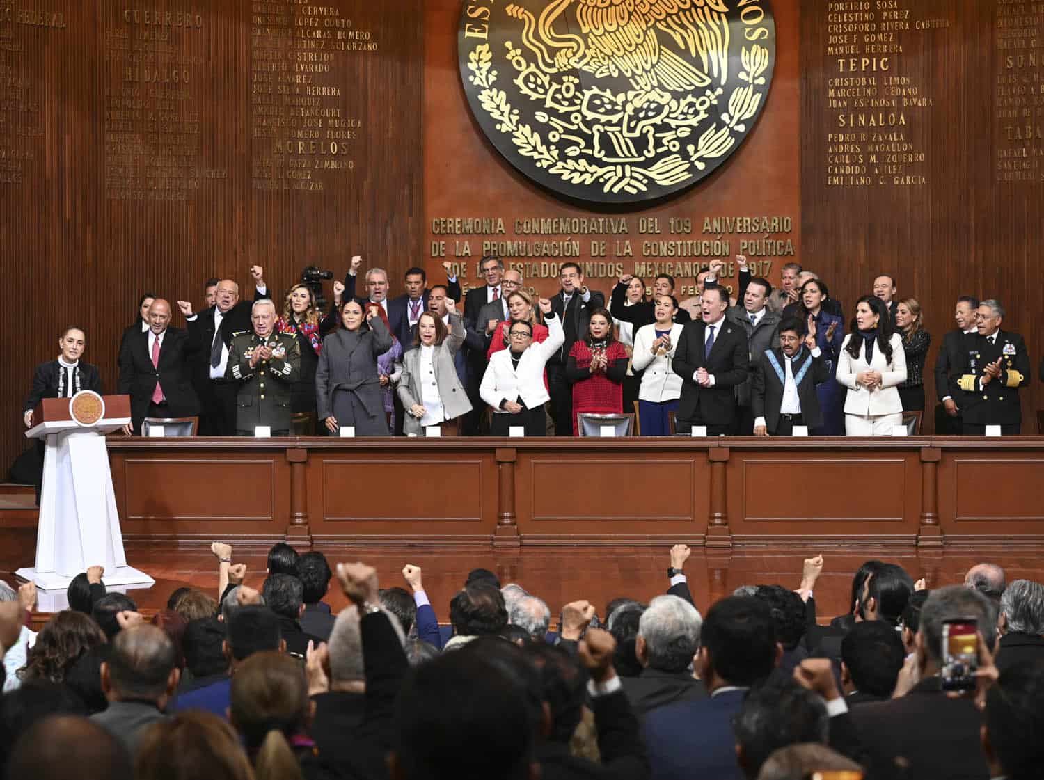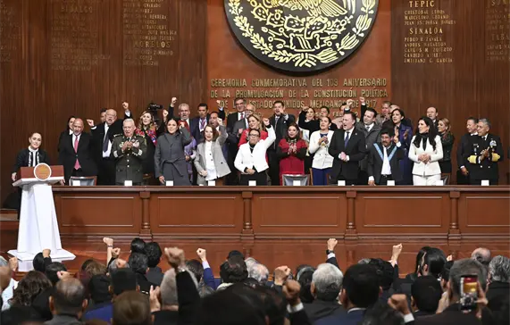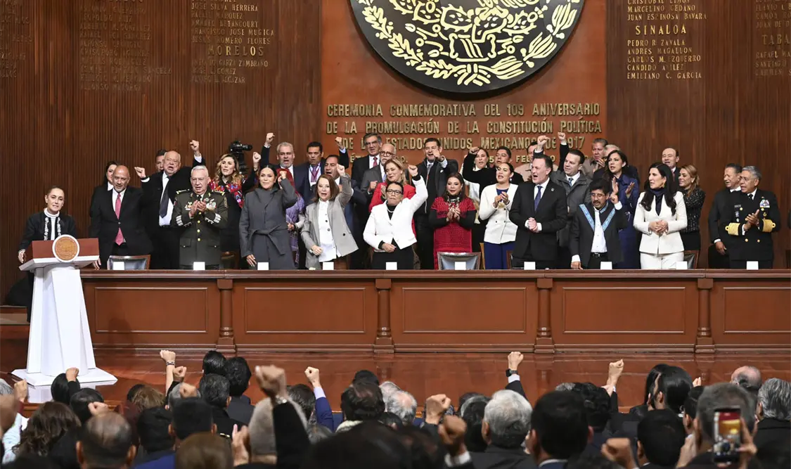 Querétaro.- Desde Querétaro, la presidenta Claudia Sheinbaum Pardo resaltó que con la Cuarta Transformación se recuperó la esencia de la Constitución Política de los Estados Unidos Mexicanos de 1917 y aseguró que el país no regresará al régimen de corrupción, de privilegios ni a ser colonia de nadie, reafirmando con fuerza que México no se doblega, no se arrodilla, no se rinde y no se vende.