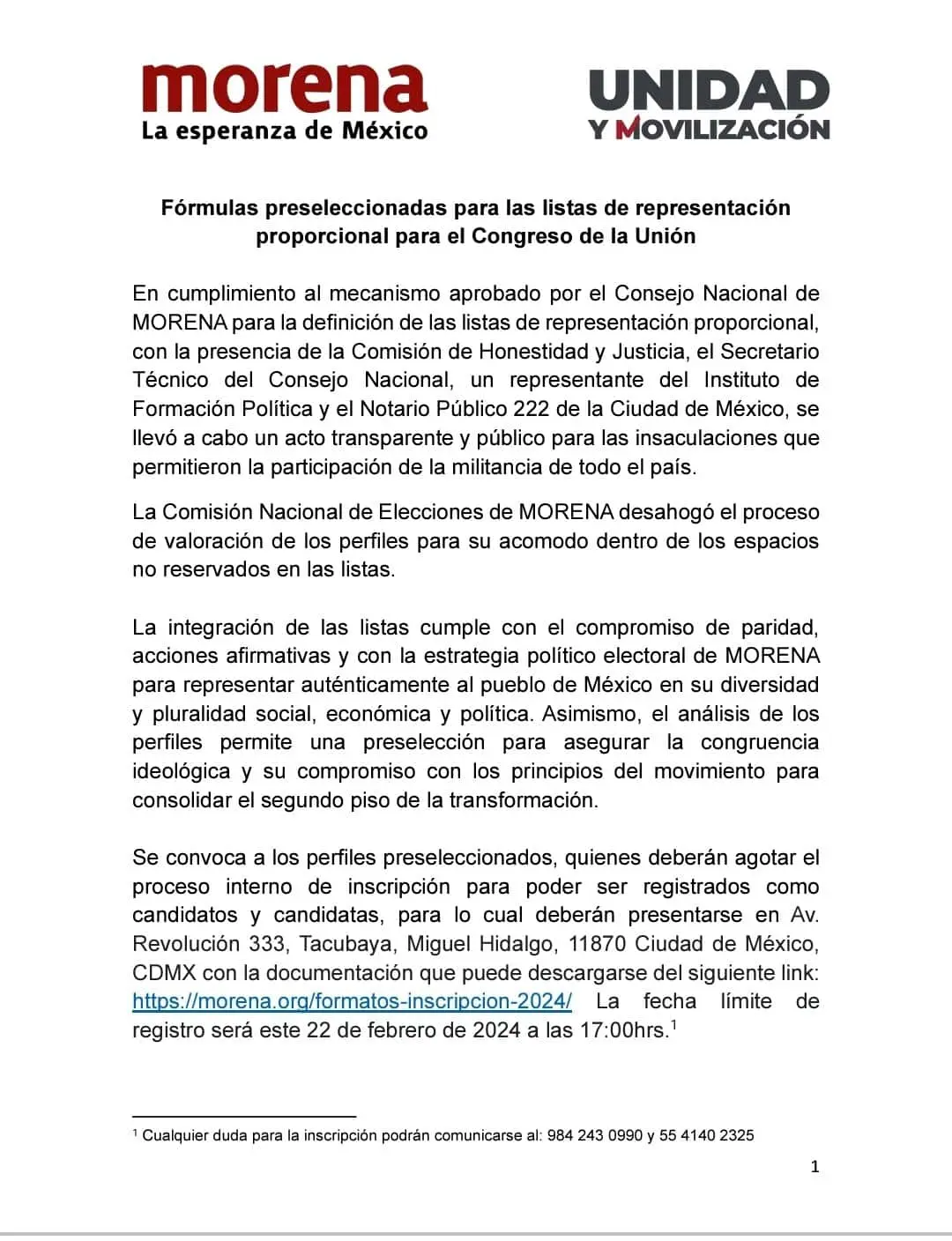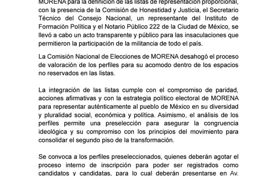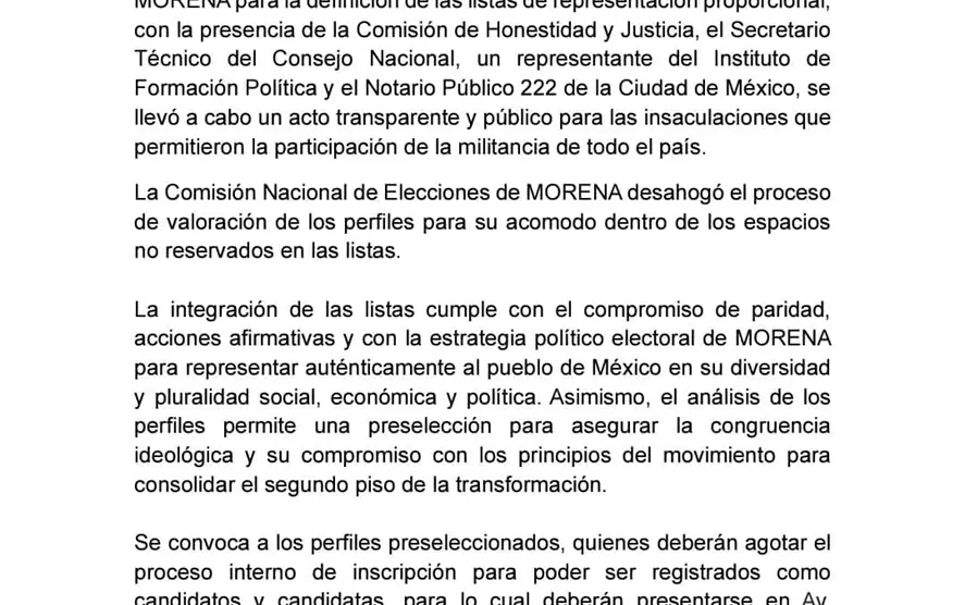 Morena presenta las fórmulas preseleccionadas para las listas de representación proporcional para el Congreso de la Unión. El acto fue calificado como transparente e incluye a la militancia en todo el país n