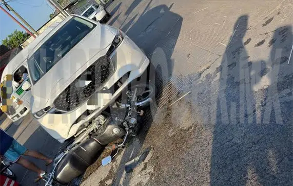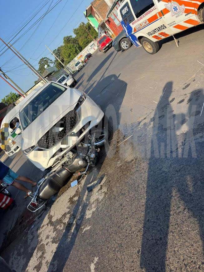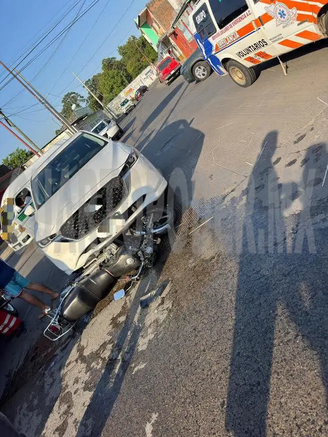 Paramédicos de la Cruz Roja brindaron atención a un joven tras estrellar la motocicleta en que se desplazaba con un vehículo, en la esquina de la 20.ª calle Oriente y 5.ª avenida Sur, en Tapachula.