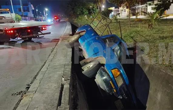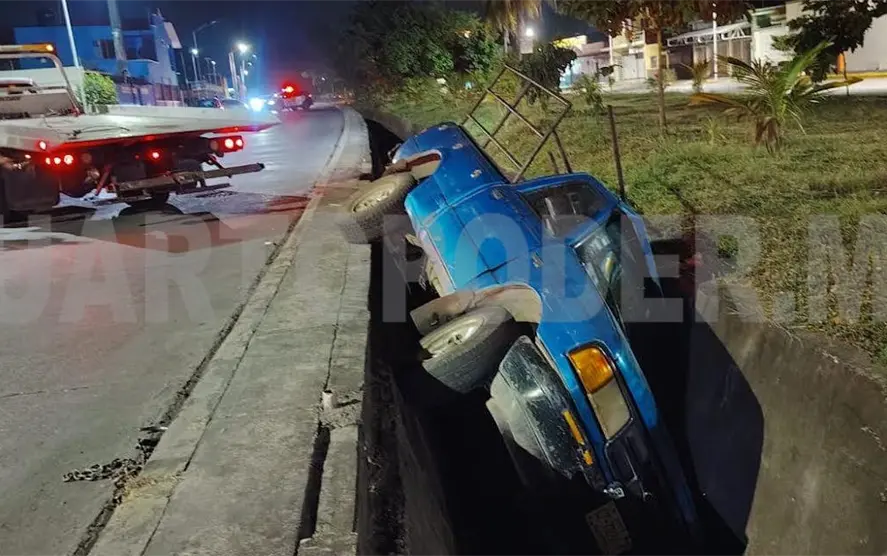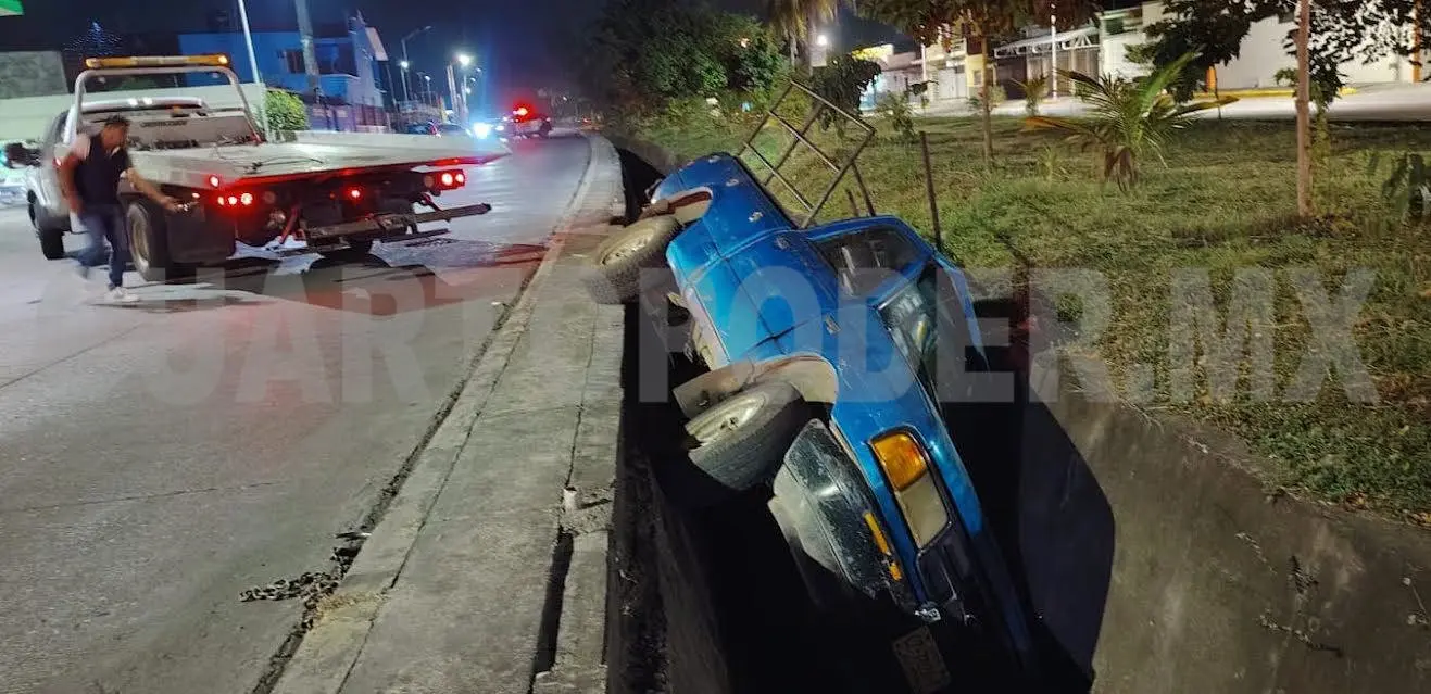 En el interior del dren pluvial del Par Vial —7.ª avenida Sur de Tapachula— quedó una camioneta luego que su conductor, un hombre de 64 años, quien resultó lesionado, perdió el control de la misma.