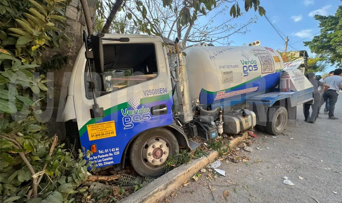 Dos personas quedaron con lesiones luego de que una pipa gasera tuviera una falla mecánica y se estrellara contra la fachada de una vivienda, en la colonia Insurgentes de la ciudad de Tuxtla Gutiérrez, el lunes por la tarde.