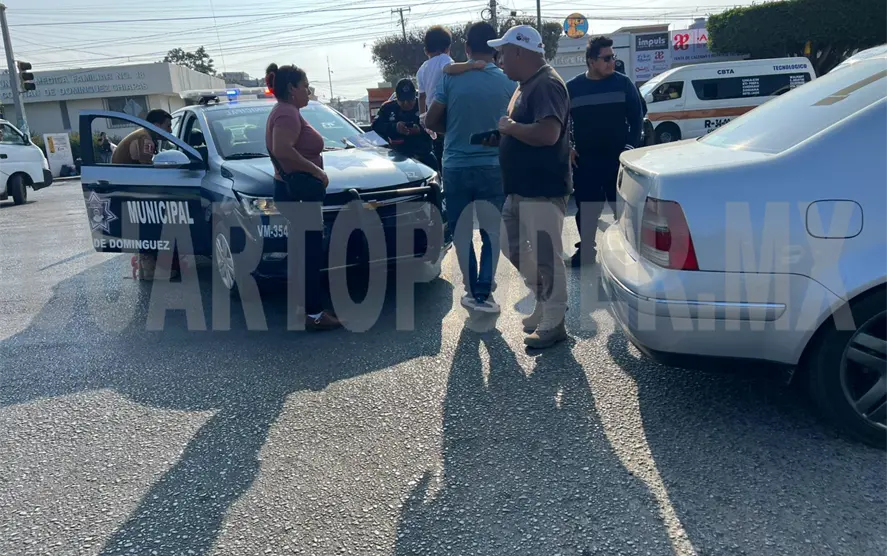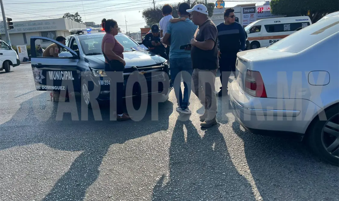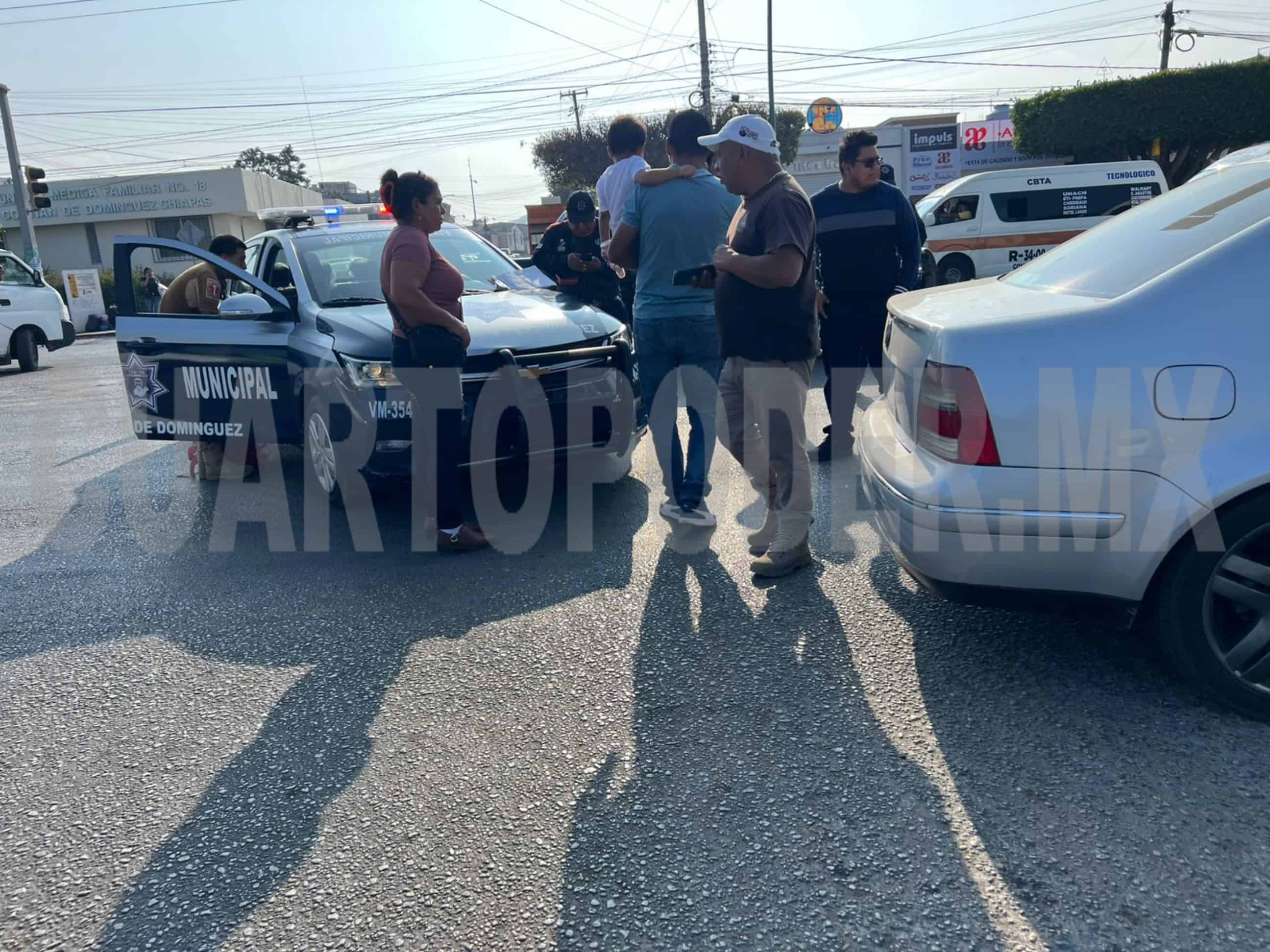 Con daños materiales y una persona lesionada se saldó el choque entre una patrulla de Tránsito y Vialidad Municipal contra un automovilista, en un bulevar de Comitán, cuando los agentes se dirigían a brindar auxilio en un percance que ocurrió minutos antes en otra parte de la ciudad.