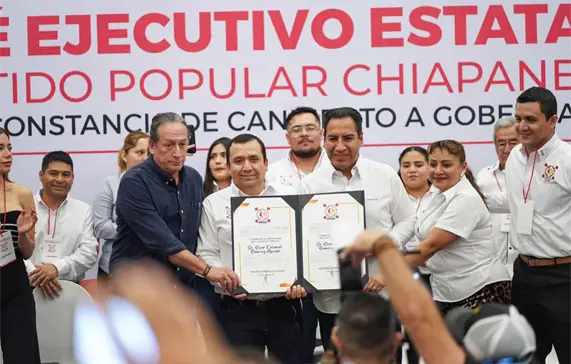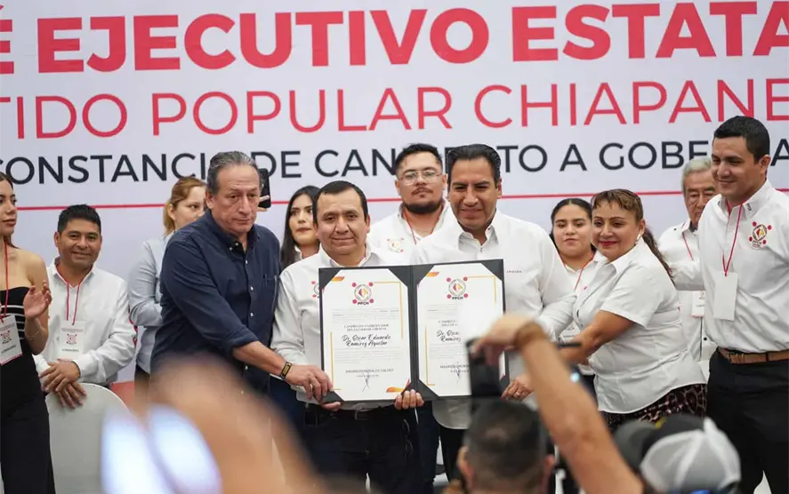 El senador con licencia, Eduardo Ramírez Aguilar, recibió la constancia de candidato a gobernador de Chiapas, para el periodo 2024-2030, de manos del presidente del Comité Ejecutivo Estatal del Partido Popular Chiapaneco (PPCH), Mauricio Morales Valdez.