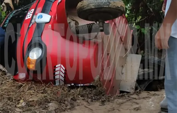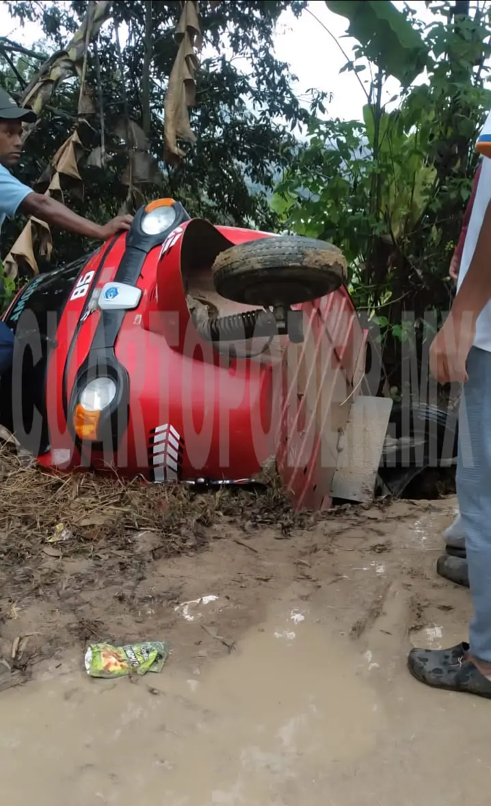 Dos personas resultaron policontundidas debido a la volcadura de un mototaxi, de los conocidos como Pochimóvil, que circulaba sobre la carretera que conecta a Chilón con Bachajón, en un tramo con pavimento resbaladizo por las lluvias, durante la mañana del viernes.