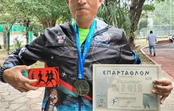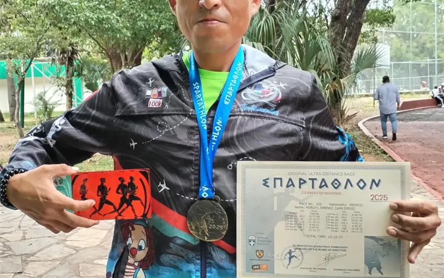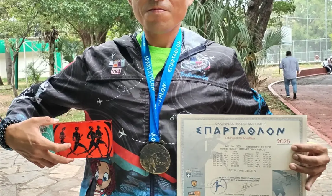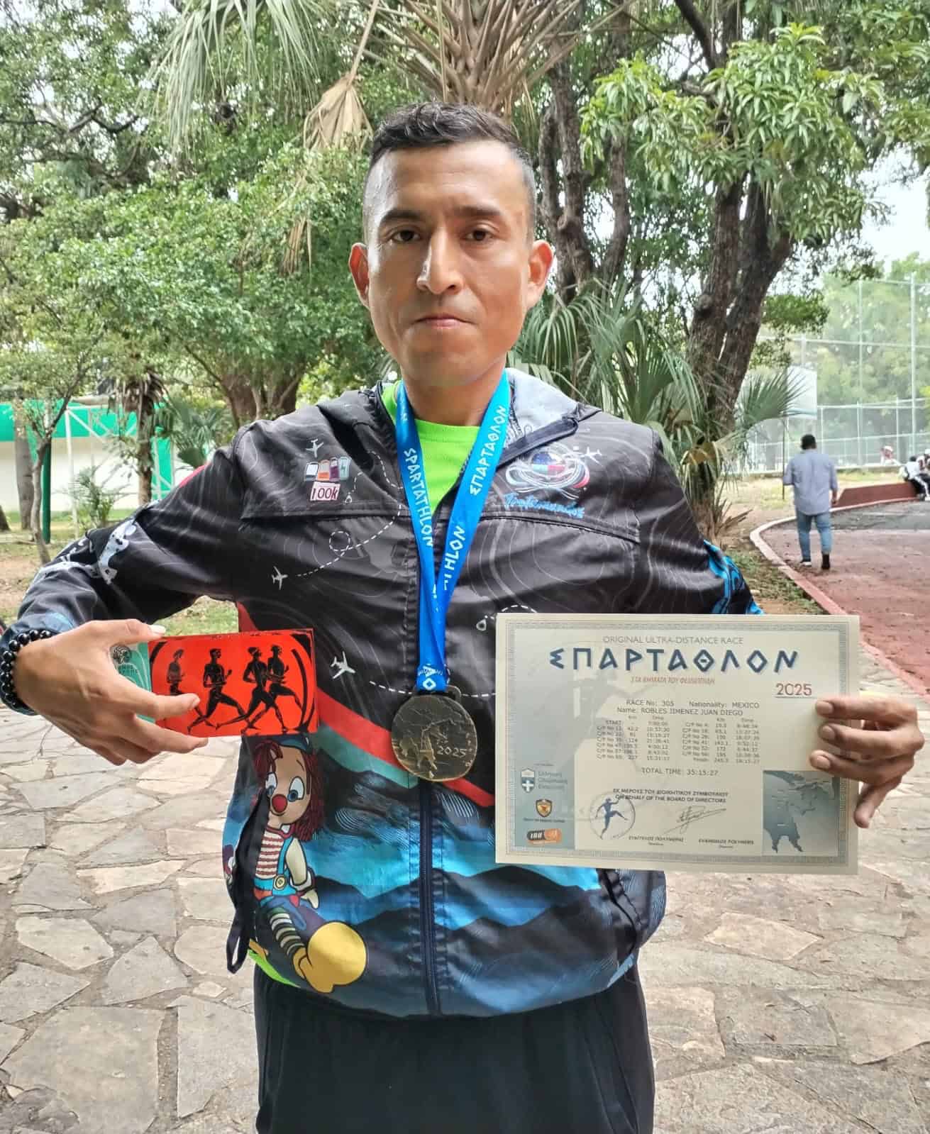Con el orgullo reflejado en su rostro y con la medalla en su cuello, el ultramaratonista chiapaneco Juan Diego Robles Jiménez, del club Trotamundos de Chiapas regresó a México tras completar el legendario Spartathlon 2025, celebrado los días 27 y 28 de septiembre en Grecia. "Reto cumplido", fueron sus primeras palabras al recordar la experiencia.
