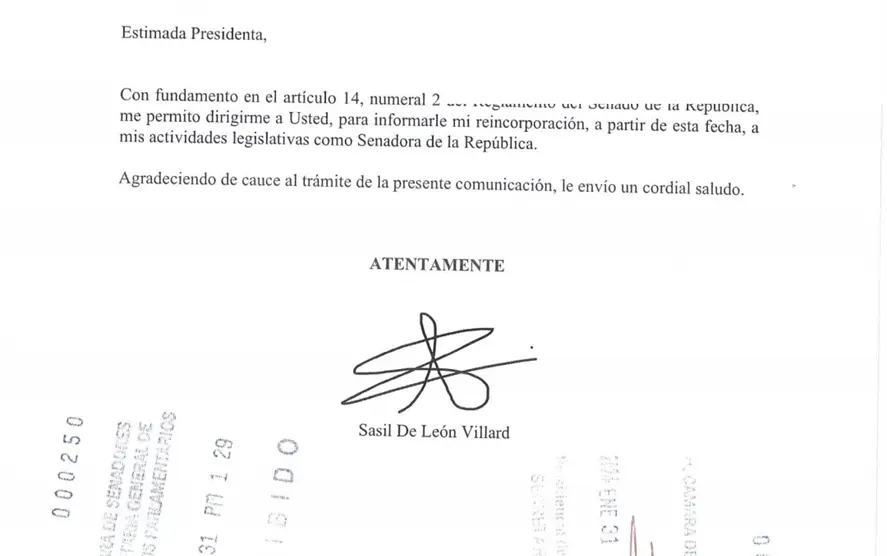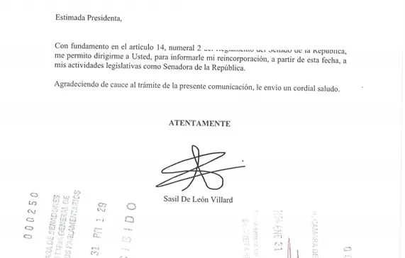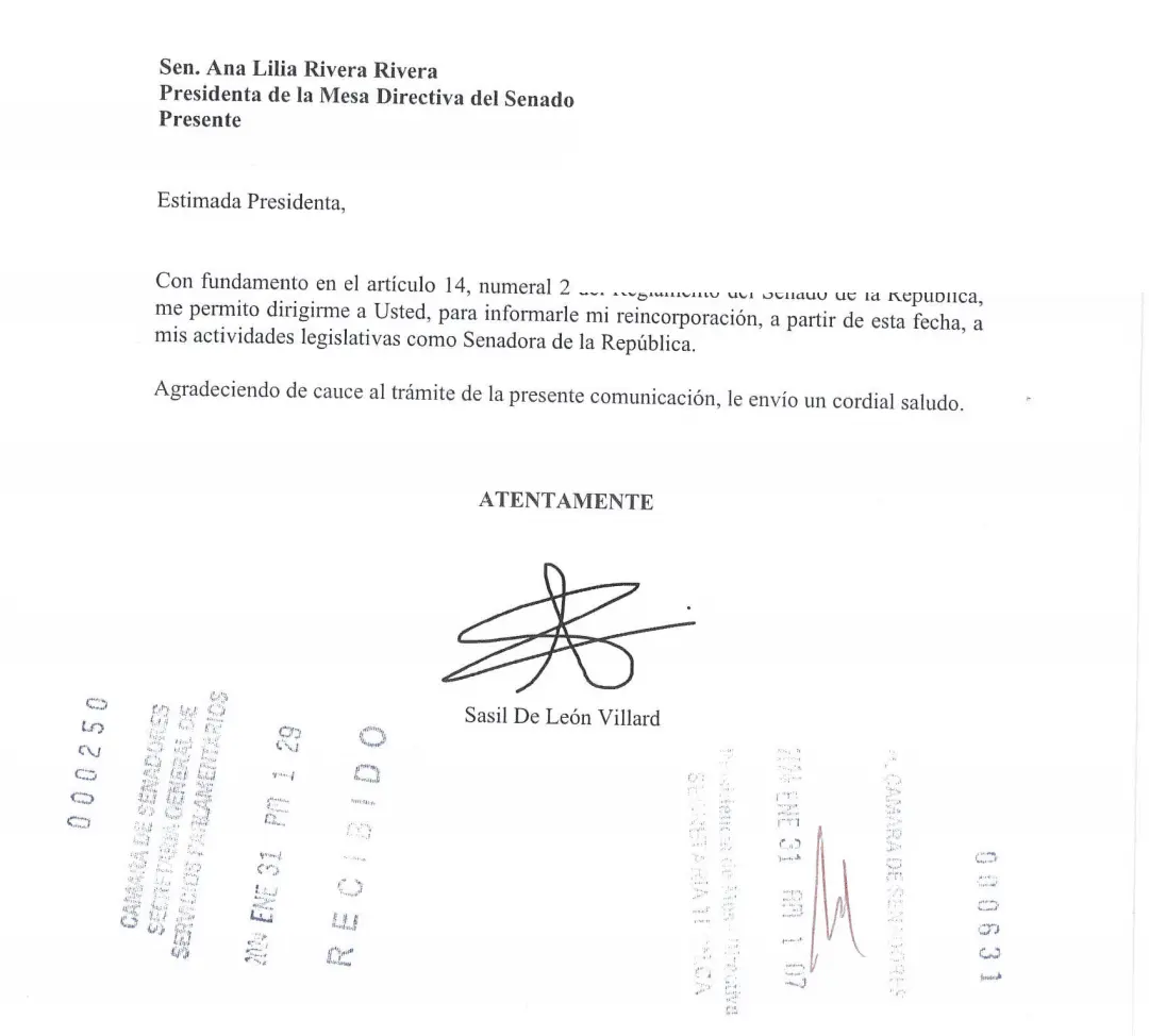 La senadora por Chiapas, Sasil de León, anuncia su reincorporación a sus actividades legislativa en el Senado de la República.