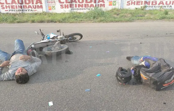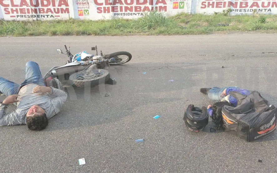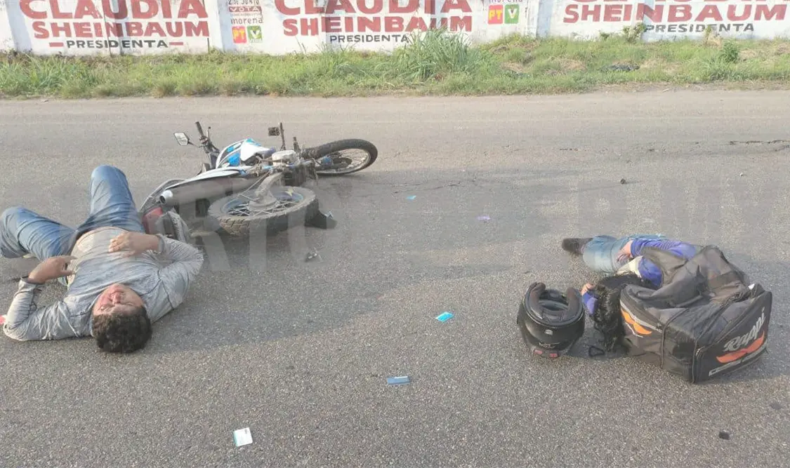 TAPACHULA. Paramédicos de la Cruz Roja Mexicana brindaron atención médica a dos jóvenes que resultaron policontundidos al ser impactada la motocicleta en la que se desplazaban en el tramo carretero Tapachula-Viva México.