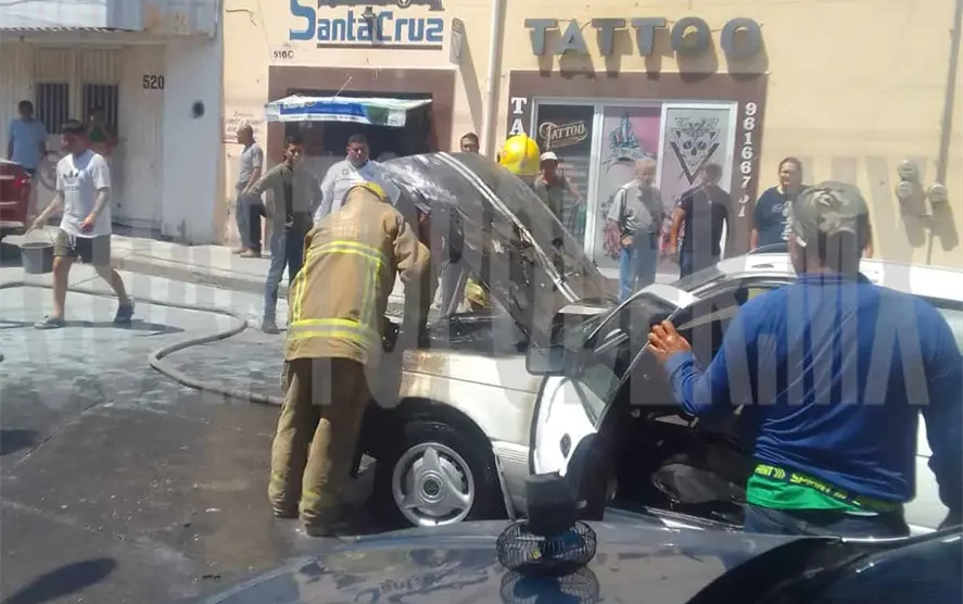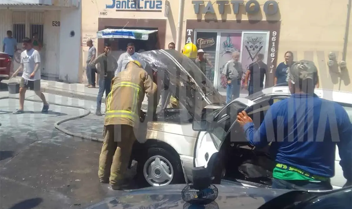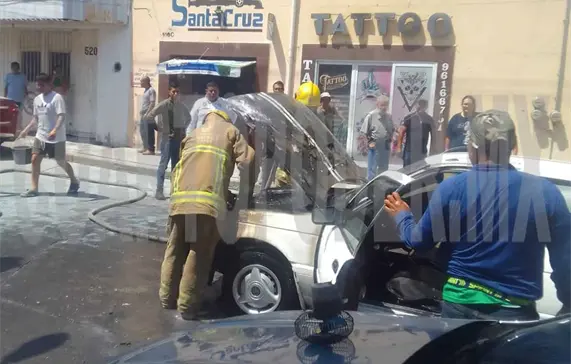 Un presunto cortocircuito originó el incendio de un vehículo Nissan Tsuru en la 6.ª Sur y 4.ª Poniente de Tuxtla Gutiérrez, la tarde del lunes.