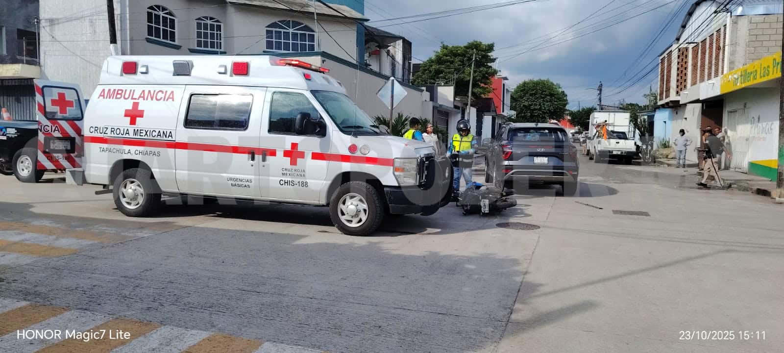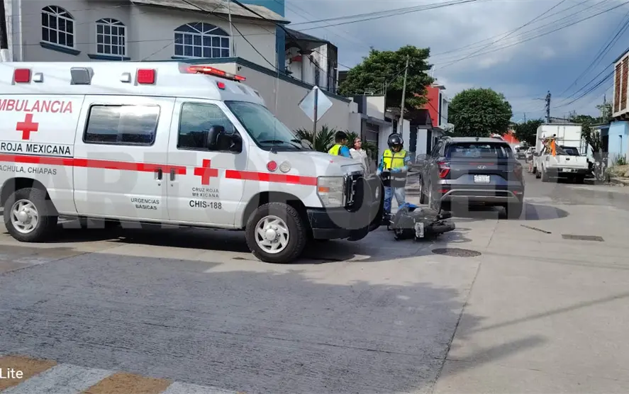 Paramédicos de la Cruz Roja Mexicana trasladaron al hospital regional a un motociclista que resultó lesionado al estrellar la unidad que conducía, acompañado de otra persona, contra un vehículo en la intersección de la 5.ª privada Norte y 31.ª calle Oriente en la colonia 5 de Febrero, al norte de la ciudad de Tapachula.