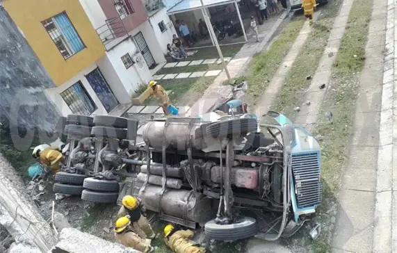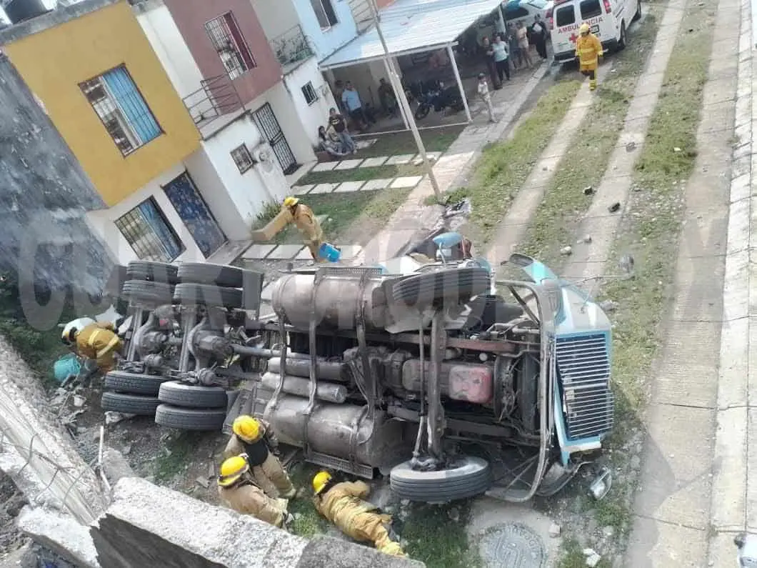 Volcado terminó un tráiler al quedarse presuntamente sin frenos, en una subida, a la salida del fraccionamiento Finca Real, al norte de Tapachula.