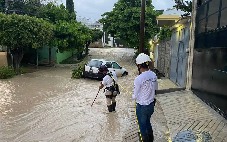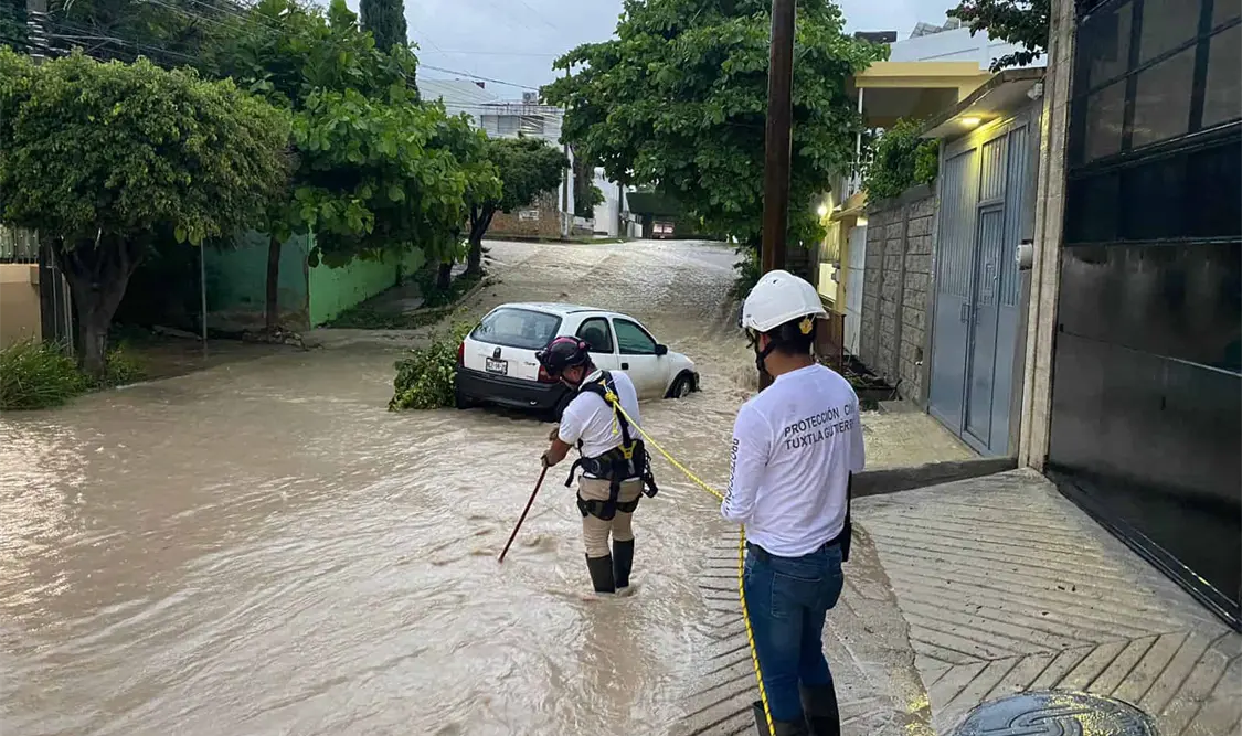 En Tuxtla Gutiérrez se han reportado cuatro viviendas encharcadas, dos vehículos arrastrados y el desborde del arroyo San Agustín en la colonia FOVISSSTE 2, así como encharcamientos y arrastre de material en las vialidades.