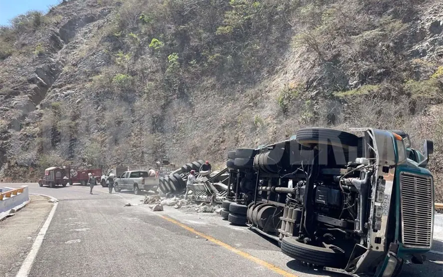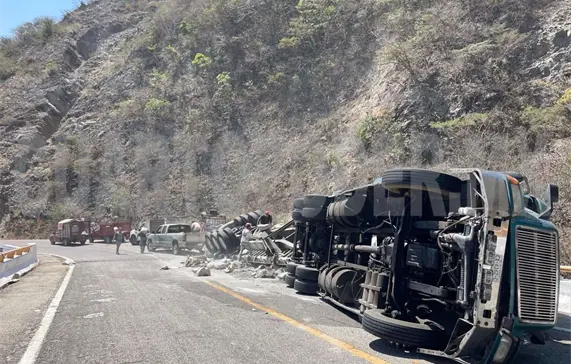 Un tráiler cargado de cemento terminó recostado sobre la carretera federal en los límites de Chiapas con el estado de Oaxaca, en la demarcación del municipio de Cintalapa, la mañana del miércoles, dejando semibloqueada la vía de comunicación, por lo que la Guardia Nacional se hizo cargo.