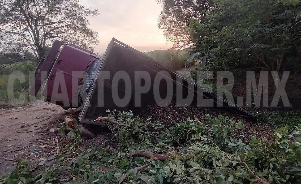Un camión cargado de caña de azúcar volcó tras caer en una zanja, en un camino de terracería en el ejido Francisco I. Madero, en la zona baja de Huixtla.