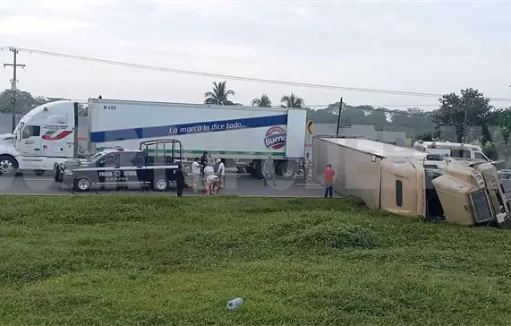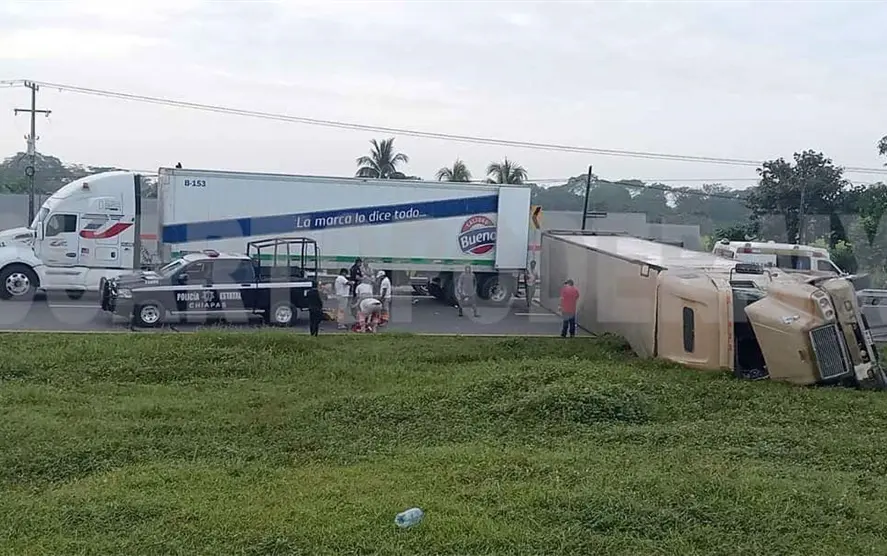 HUIXTLA. Un tráiler que transportaba varias toneladas de productos de abarrotes terminó volcado tras chocar contra la barra metálica de protección de la carretera en el tramo Villa Comaltitlán-Huixtla. Fue a la altura del kilómetro 245, a unos metros de la antigua caseta migratoria de El Hueyate en donde ocurrió el percance que dejó daños materiales por varios miles de pesos y el chofer, Juan “N” (65 años), con crisis nerviosa y golpes leves, aunque no hubo necesidad de trasladarlo a un hospital.