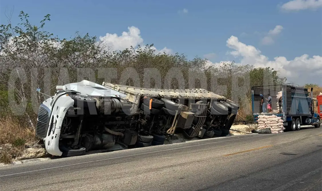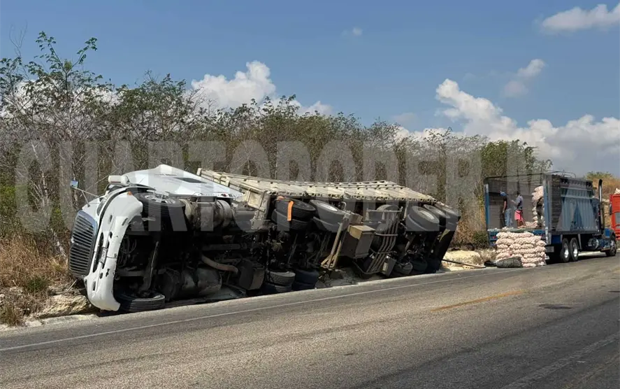 Daños materiales que ascendieron a varios miles de pesos dejó como saldo la aparatosa volcadura de un tráiler que transportaba costales con cebollas sobre el nuevo libramiento Sur, a la altura del desvío de la colonia Raymundo Enríquez (Villahermosa), en la demarcación de la capital Tuxtla Gutiérrez.