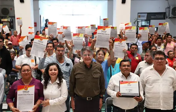 Con la finalidad de brindar certeza jurídica al patrimonio de las familias tuxtlecas, el alcalde Carlos Morales Vázquez realizó la entrega de 110 escrituras públicas y certificación de regularización de la Colonia Condesa 1ª Sección. En este evento, el alcalde capitalino destacó que una de las prioridades de su gobierno es la atención a los grupos vulnerables, identificando y superando los obstáculos que permitan un trato más justo e incluyente dentro de las actividades de las familias tuxtlecas, contando siempre con el apoyo del gobierno estatal.