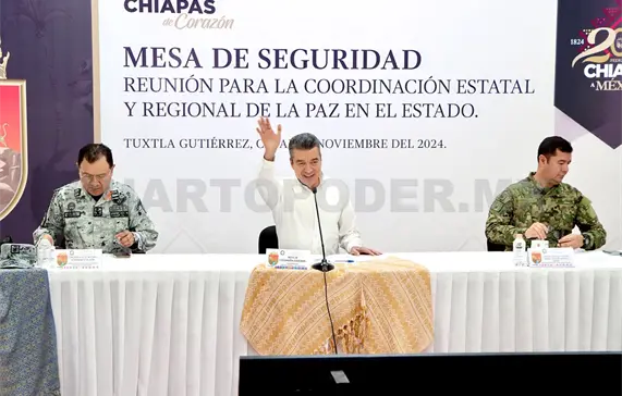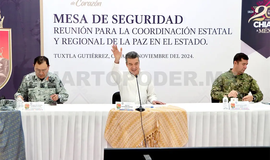En el marco de la Mesa de Coordinación Estatal para la Construcción de la Paz y la Seguridad, el gobernador Rutilio Escandón Cadenas destacó que las actividades y manifestaciones en Chiapas por el Día Internacional de la Eliminación de la Violencia contra las Mujeres, se llevaron a cabo de manera pacífica y con absoluto respeto a las normas jurídicas y, sobre todo, de la población.