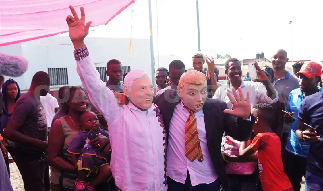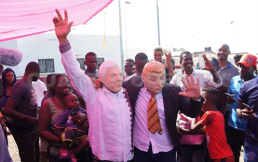 Niños y adultos rodearon a las dos personas que llegaron vestidos como los mandatarios de México y Estados Unidos hasta el lugar en donde mantienen un plantón desde hace 27 días y ahí gritaron consignas de “paso libre a los migrantes”, libertad y vivas para México y África.