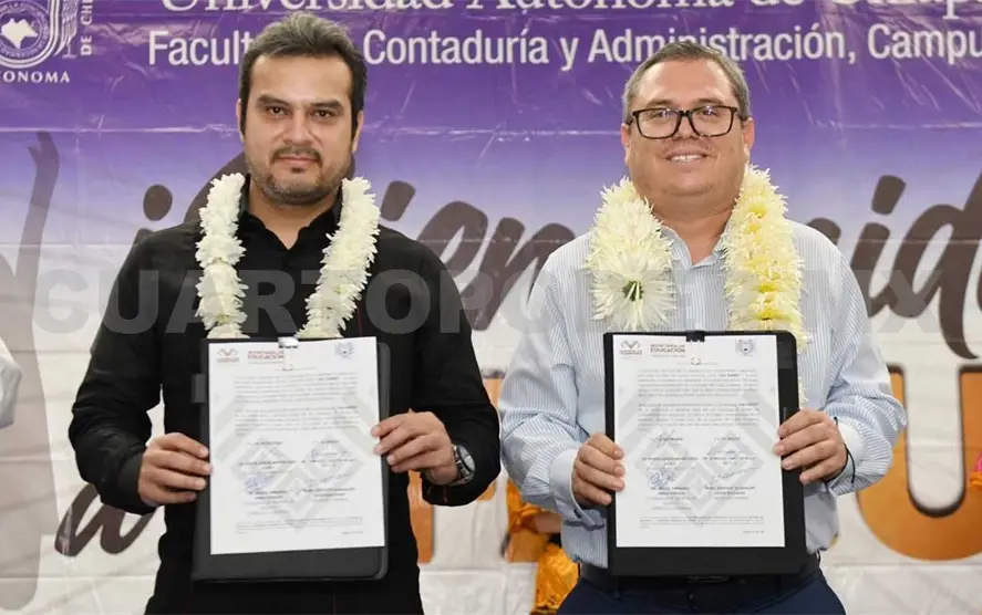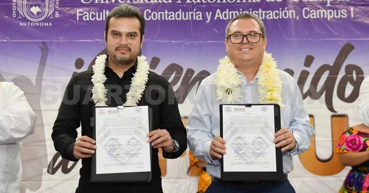 Para promover el fortalecimiento de la educación superior, el rector de la Universidad Autónoma de Chiapas (Unach), Oswaldo Chacón Rojas, y el secretario de Educación del Estado (SE), Roger Adrián Mandujano Ayala, firmaron un Convenio General de Colaboración.