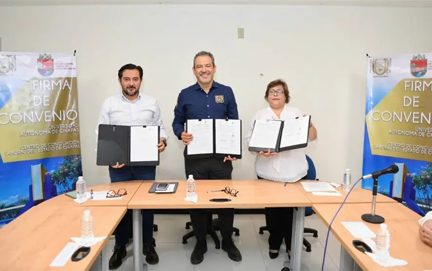 Este acuerdo que beneficiará a estudiantes de la Facultad de Derecho, Campus III, San Cristóbal de las Casas y las extensiones con sede en los municipios de Palenque y Tapachula, además de la Licenciatura en Derecho, que imparte el Instituto de Investigaciones Jurídicas, también contempla la realización de cursos talleres y diplomados en materia de conciliación y mediación en materia laboral.
