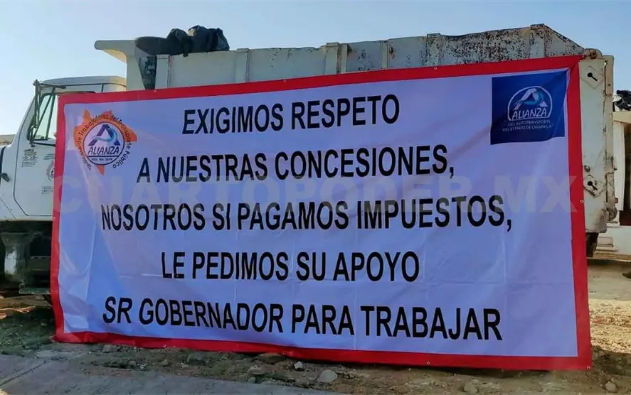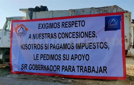 “Exigimos respeto a nuestras concesiones, nosotros sí pagamos impuestos”, “Respeto a la ley, pedimos a los que ejecuten la obra pública en los tres órdenes de gobierno”, son algunas de las frases que fueron escritas en las lonas que se pusieron sobre los volteos.