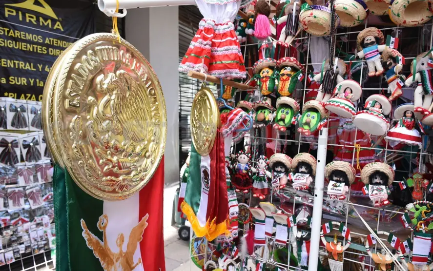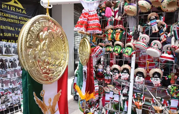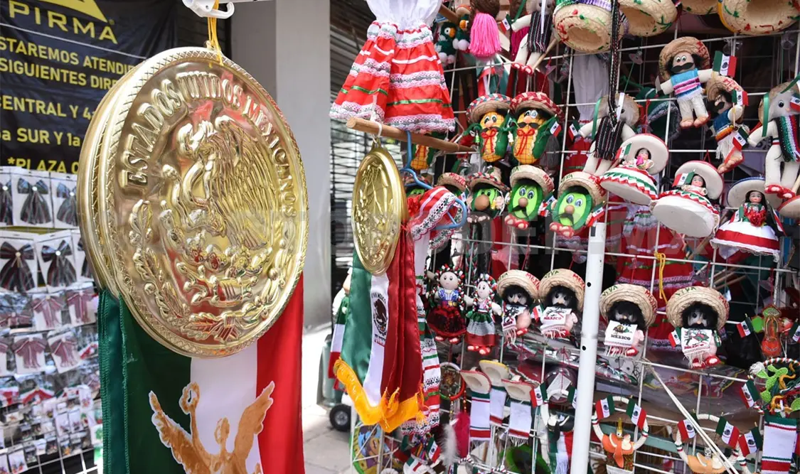 Otro puesto que se instaló en la calle 2.ª Poniente, también ofrece productos patrios; los sombreros y bigotes falsos relucen. Ulises, un joven vendedor comparte que apenas inició su venta hace dos días, debido a que todo lo trajo de Toluca.
