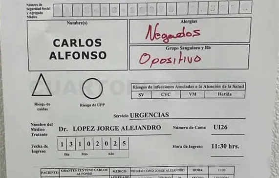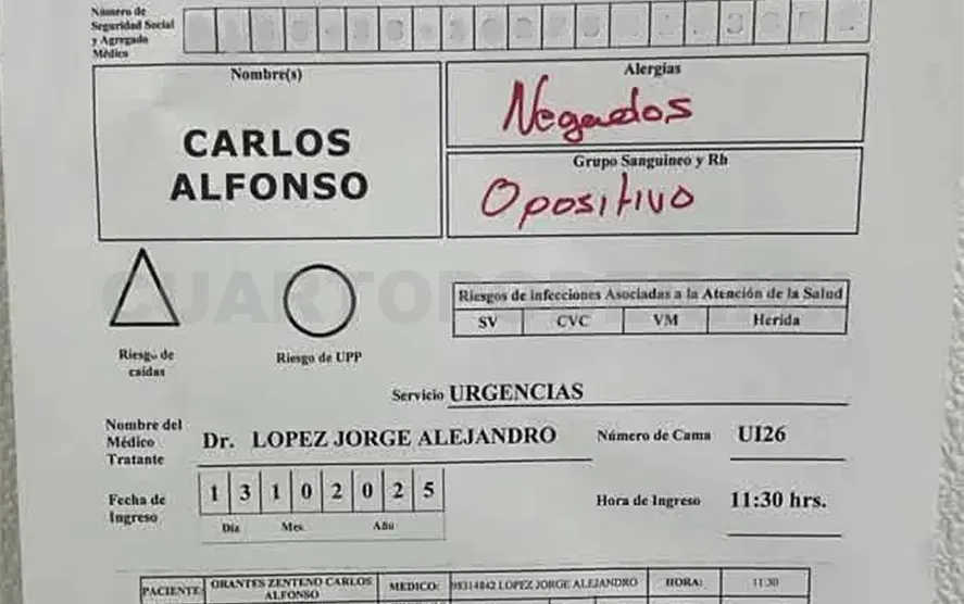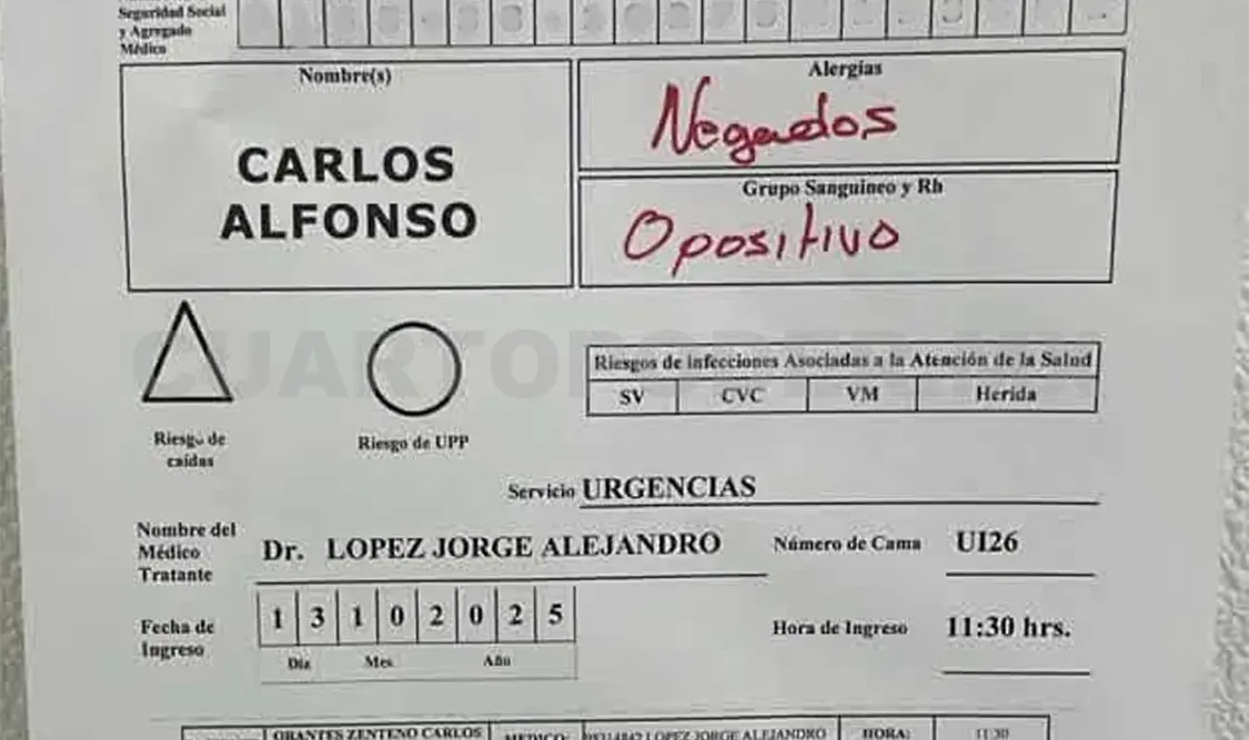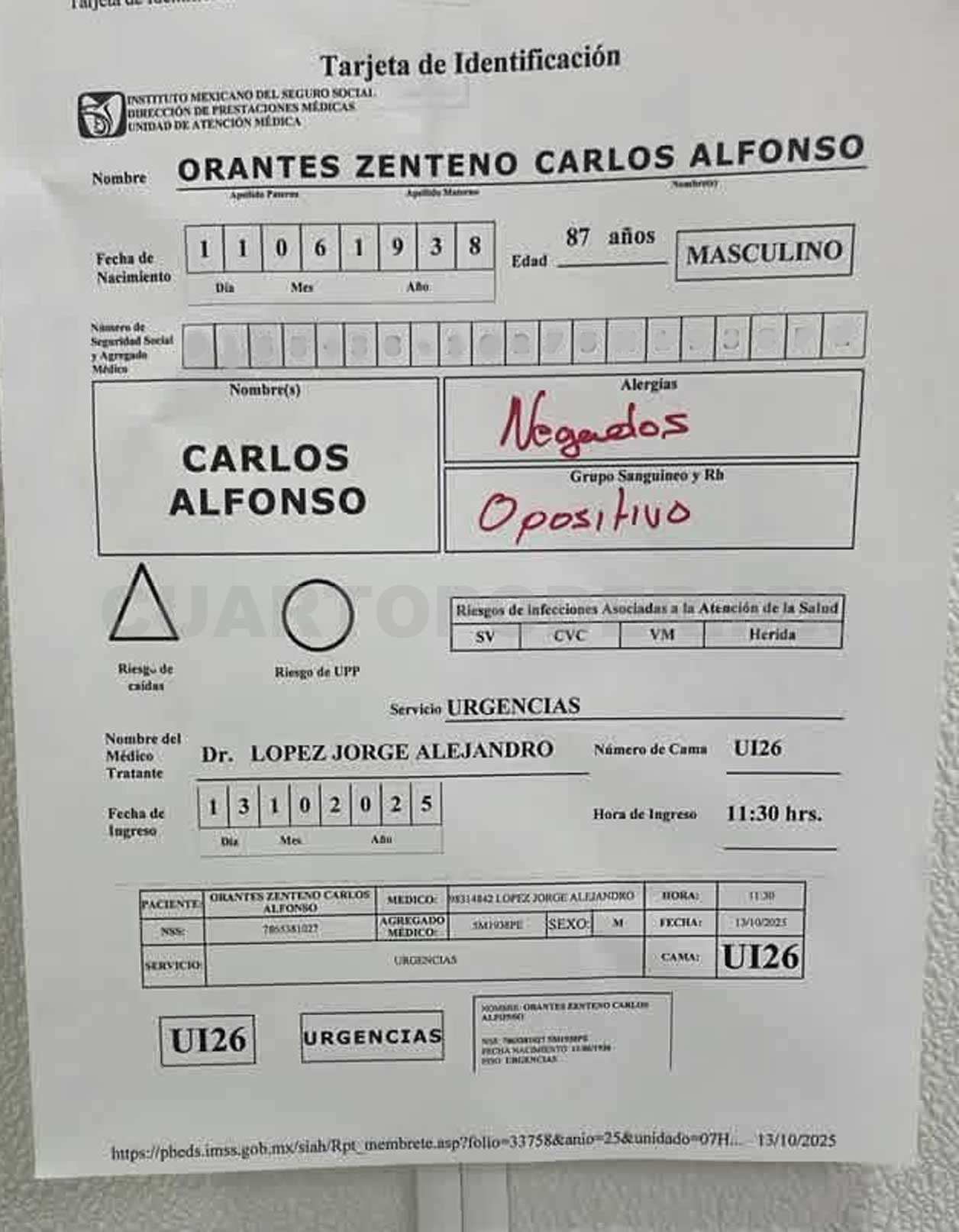El adulto mayor, de 87 años de edad, presenta una fractura de fémur, además de enfermedades como hipertensión y diabetes. Fue ingresado al área de urgencias desde el 13 de octubre aproximadamente a las 11 de la mañana en donde se encuentra hasta la fecha.