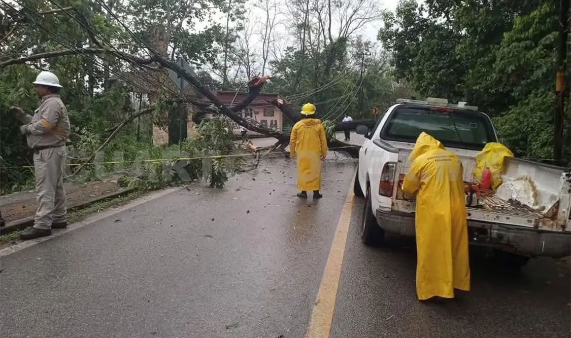 En el municipio de Palenque, los fuertes vientos y lluvias que azotaron en las últimas horas, ocasionaron la caída de árboles en la carretera que comunica a la zona arqueológica, para ser precisos a la altura del hotel Chan-Kah.