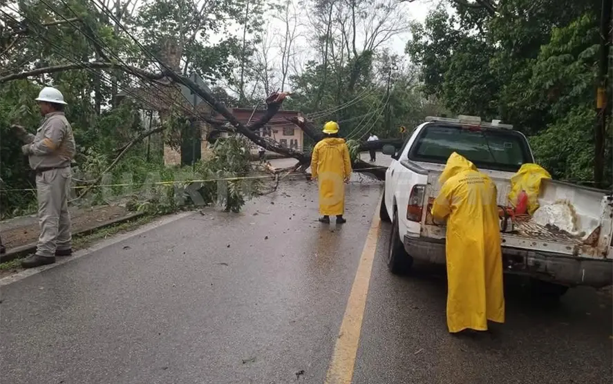 En el municipio de Salto de Agua, personal de Protección Civil y de Obras Públicas, hicieron lo mismo, retirando todo tipo de árboles y ramas en la carretera que comunica a la cabecera municipal de Salto de Agua con la comunidad Paso Naranjo, a la altura del balneario Tuli-Ha.