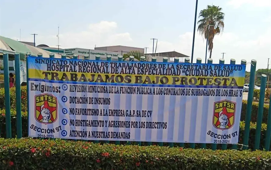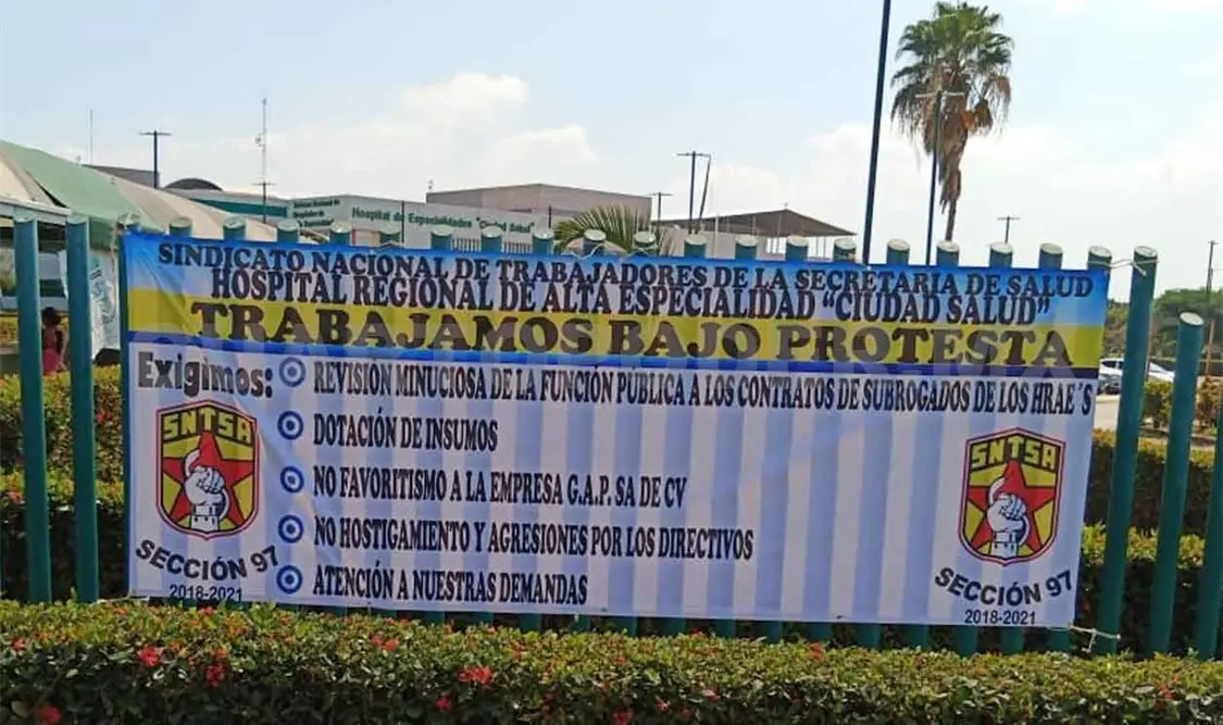 A una semana de iniciar actividades de protesta por la falta de abastecimiento de insumos suficientes para las áreas de laboratorio y transfusión, el personal del hospital de especialidades Ciudad Salud, en Tapachula, instaló mantas y pancartas para dar a conocer la problemática.